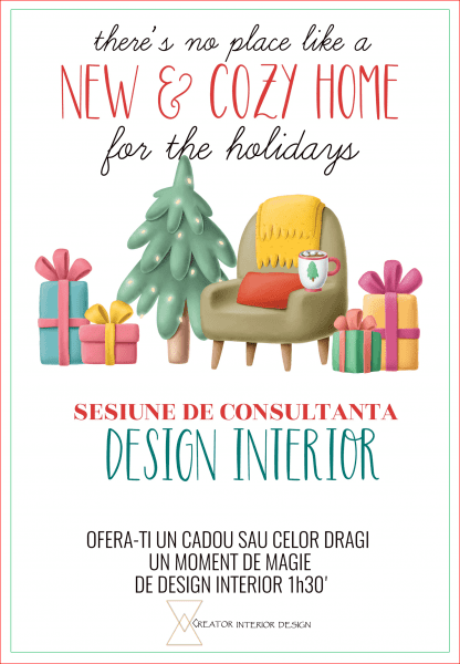 Creator Interior Design ofera o sesiune de consultanta privind designul interiorului tau sau unei persoane dragi. Pe parcursul unei ore si jumatate, dezbatem impreuna idei despre stilul tau de design, recompartimentarea, amenajarea si redecorarea spatiului arhitectural. Tratam in 2D releveul spatiului, stabilim zone ce se creeaza, flux de circulatie si functionalitatea spatiilor. Vorbim despre forme, culori, texturi si te ghidam sa-ti alegi produsele.