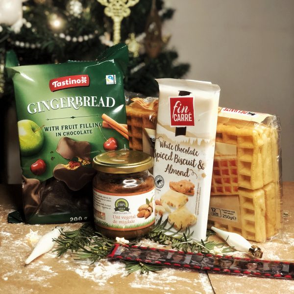 Pentru ca cel mic sa fie si mai incantat de cadou am adaugat si gofre, perfecte pentru nutella sanatoasa, o ciocolata alba cu biscuiti si alune si turta dulce in ciocolata, cu umplutura de fructe.