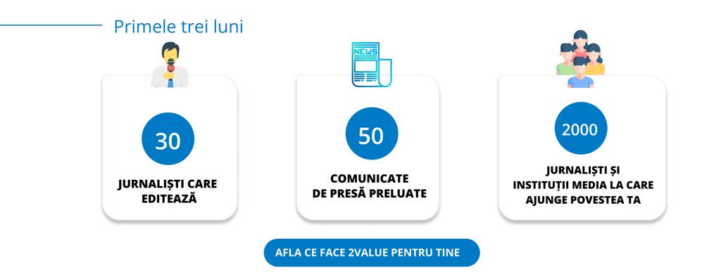 2value este prietenul tău de comunicare și promovare în media! Te ghidează să scrii cel mai bun conținut media, jurnaliștii îl editează pentru a-l face mai valoros și îl distribuie către presa selectată, pe care să o convingem să îl preia. Ai cel puțin trei apariții media garantate, la câteva click-uri distanță. Prin tehnologia unică, apari în media locală și națională, la costuri foarte accesibile. Inovația platformei transformă modul în care comunică azi jurnaliștii și companiile. De 8 ori mai multă valoare la cel mai mic preț din piață.