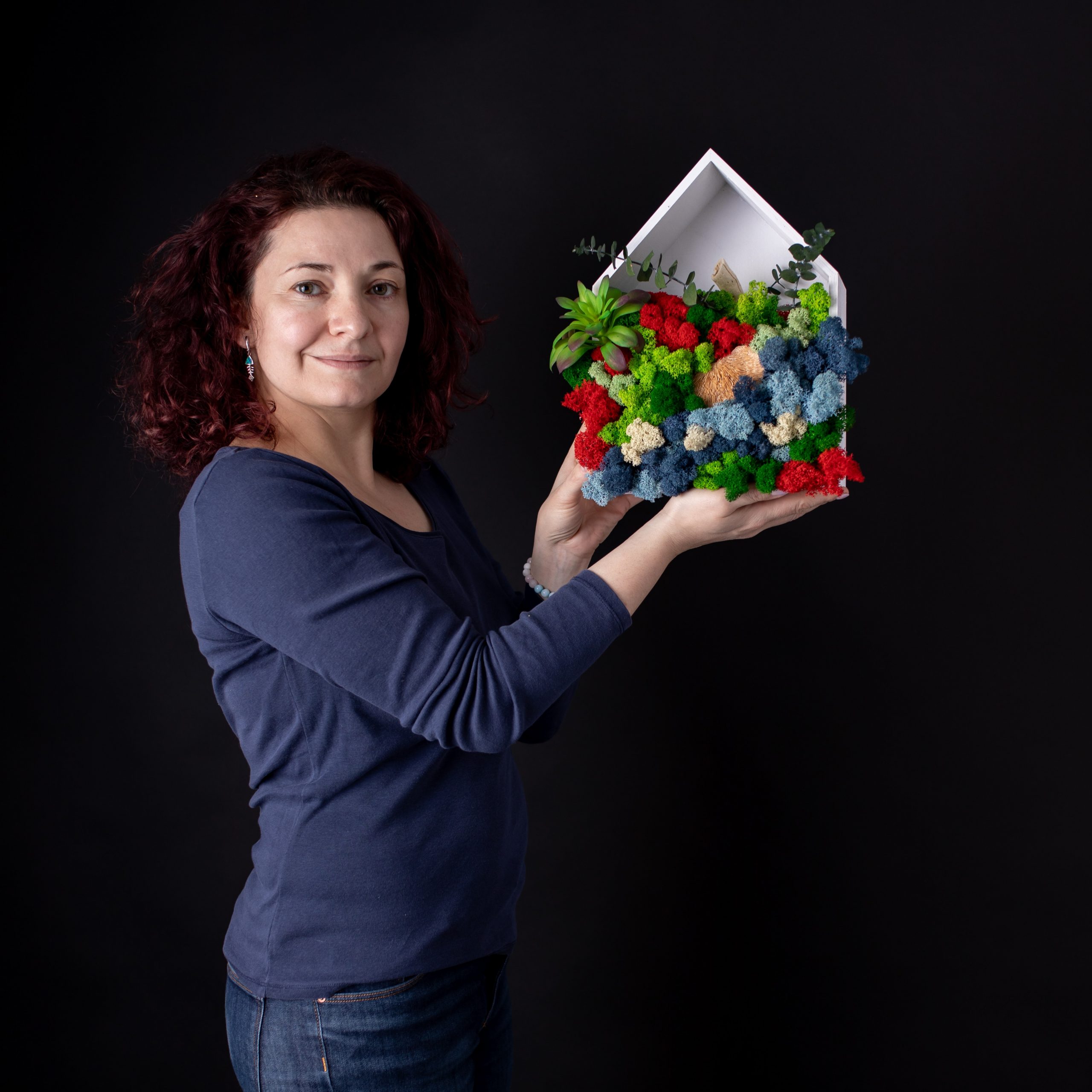 În atelierul din Săcele am creat conceptul ARTĂ de PURTAT prin realizarea de picturi pe tricouri și alte articole vestimentare și aduc NATURA în CASĂ prin decorațiuni unice cu licheni stabilizați.