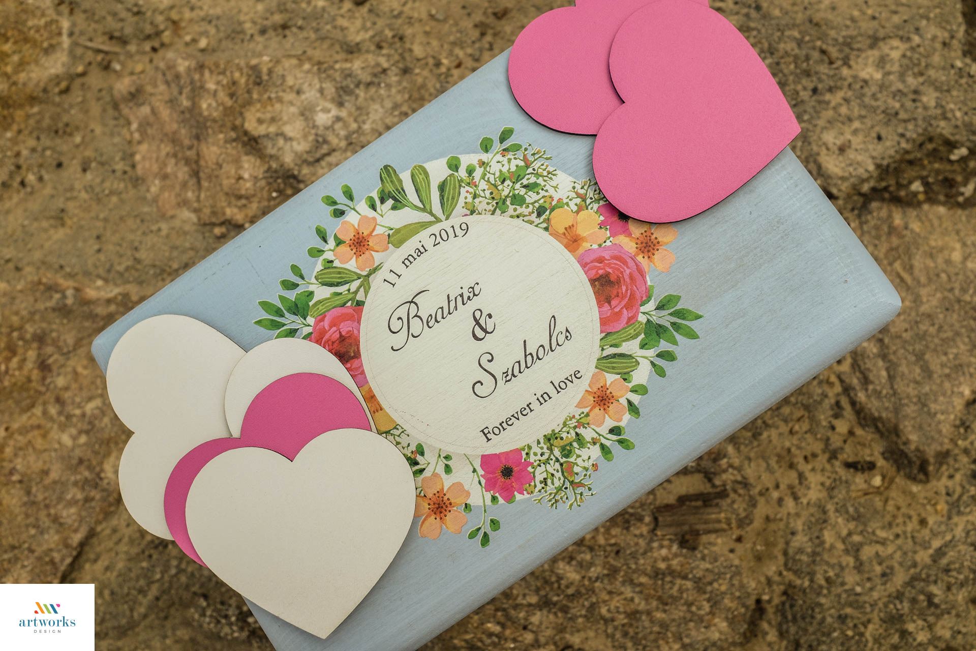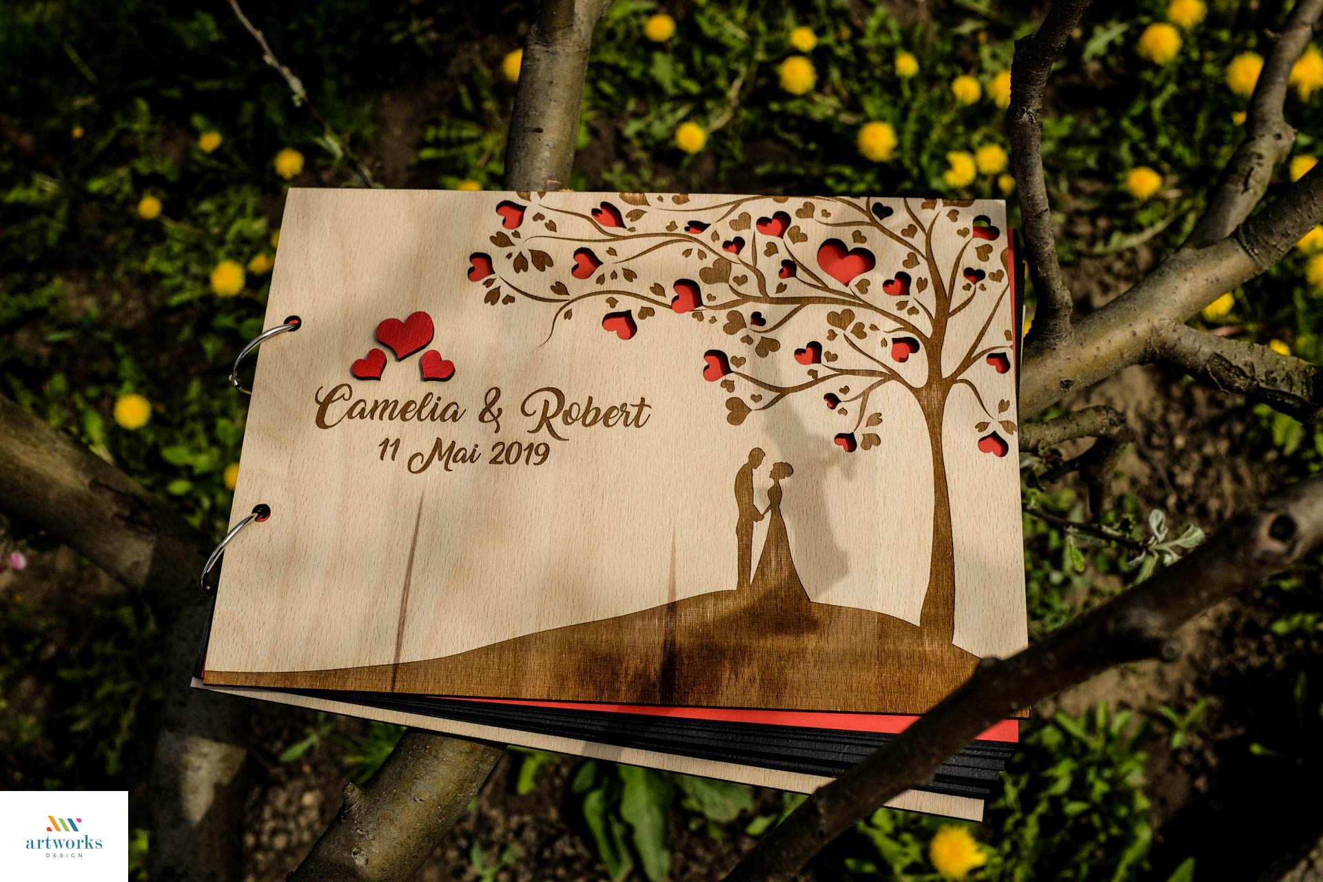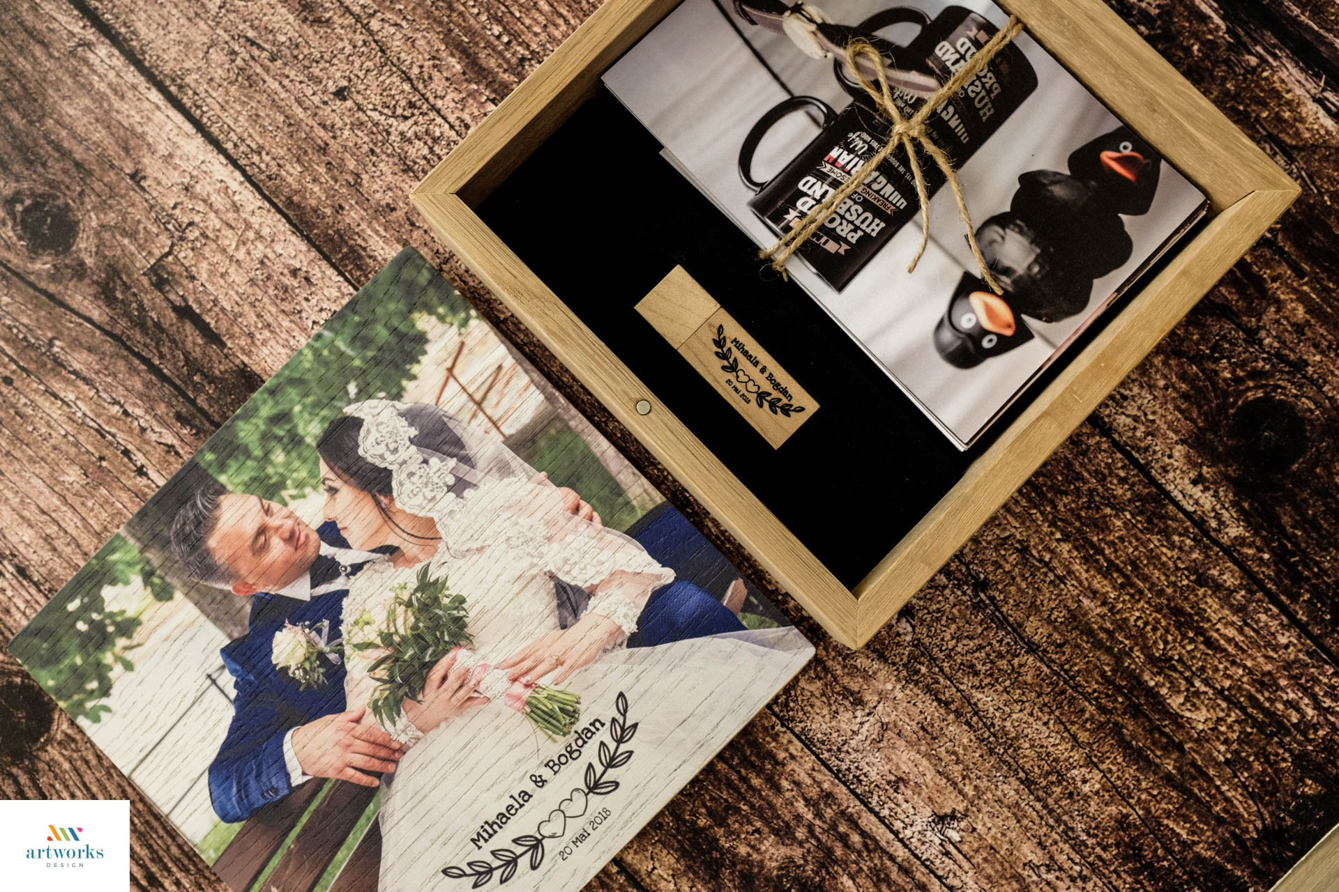 Produse personalizate, tip WEDDING sau GIFT: cutii din lemn, memorii USB, guestbook-uri, cutii verighete, cufare, tablouri din lemn, stampile sigiliu, invitații din lemn, platouri, tocătoare, etc. Produsele pot fi personalizate prin gravura laser sau print UV.