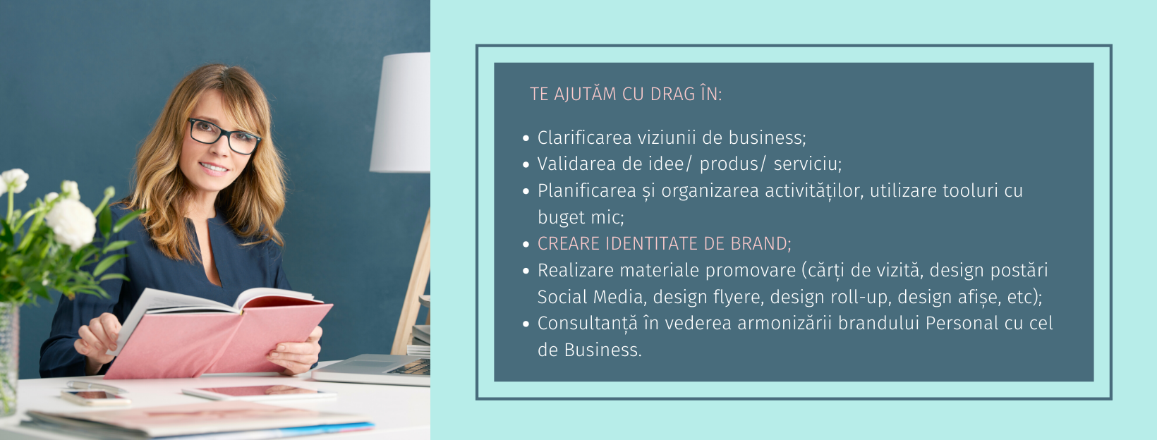 Lucrez cu entuziasm în a ajuta oameni creativi, cu daruri minunate, care vor să înceapă un business din pasiunea sau expertiza lor, și au nevoie de o identitate de brand reprezentativă.