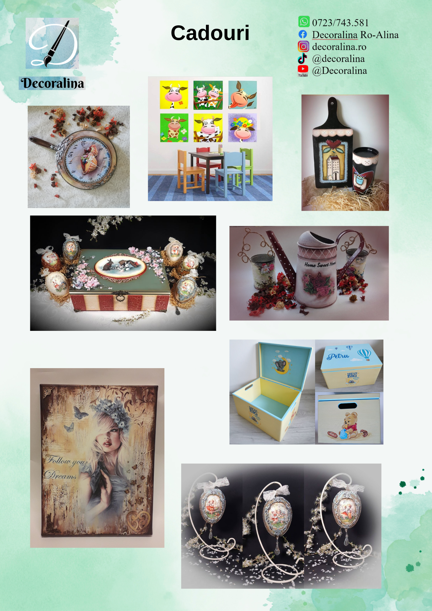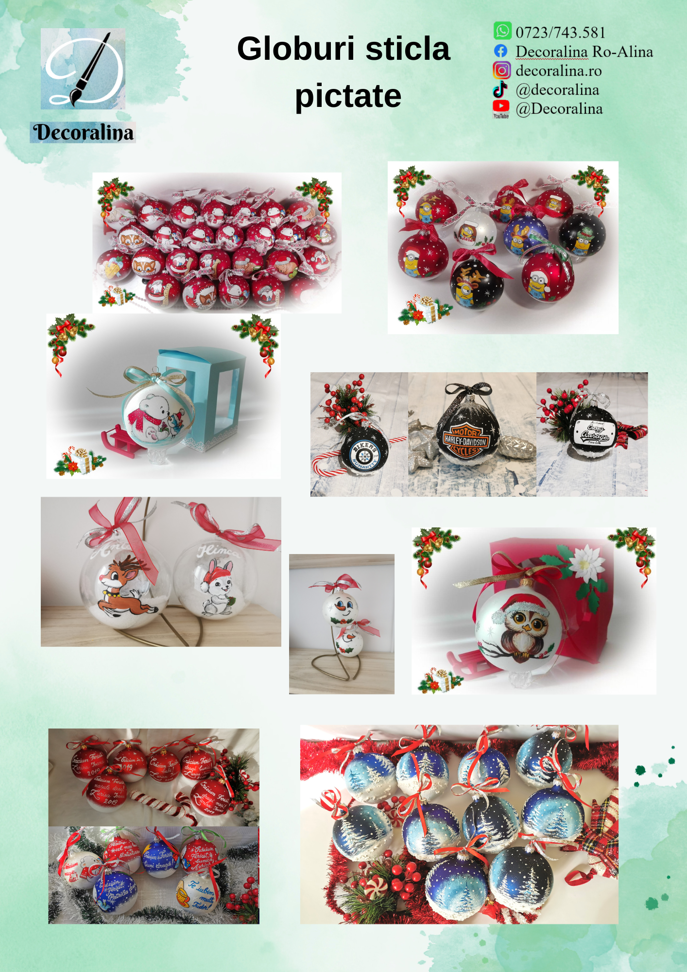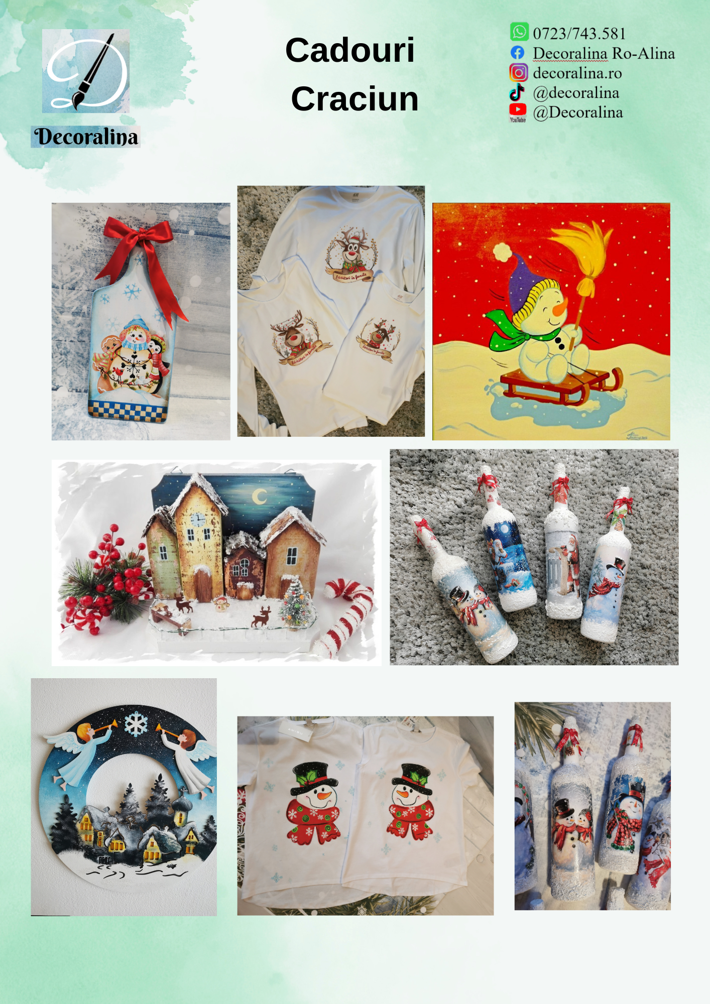 - Pictura pe globuri din sticla, diverse cadouri pentru ocazii diferite: semne de carte din piele naturală sau carton, sticle decorate prin pictura sau diverse tehnici, cutii din lemn pictate sau decorate cu tehnici decoupage, decoratiuni din sticla, metal, lemn, ceramica, piatră etc.