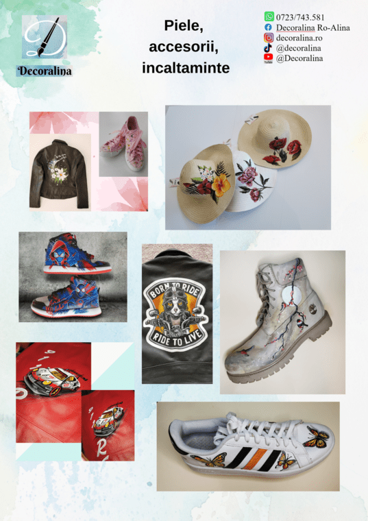 - La articolele din piele, folosesc vopsele speciale pentru piele, non-toxice, pe bază de apă, la final protejate cu 3 straturi de lac. Întretinerea este usoara, încălțămintea se șterge cu lavete din bumbac pe suprafața pictată, iar hainele este de preferat să se curețe la o curățătorie specializată.