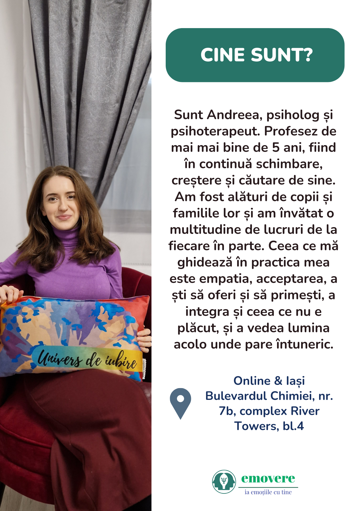 Singurul centru de testare complexă acreditat din regiunea de Nord-Est a țării, Emovere promovează servicii psihologice de specialitate, ce vizează testarea psihologică pentru copii, tineri și adulți, planuri și recomandări educaționale, testare angajați, precum și servicii de psihoterapie. Punem emoțiile în mișcare și le traducem în reacții și trăiri conștiente, pentru a transforma gândurile și credințele noastre în realitatea exterioară pe care ne-o dorim.