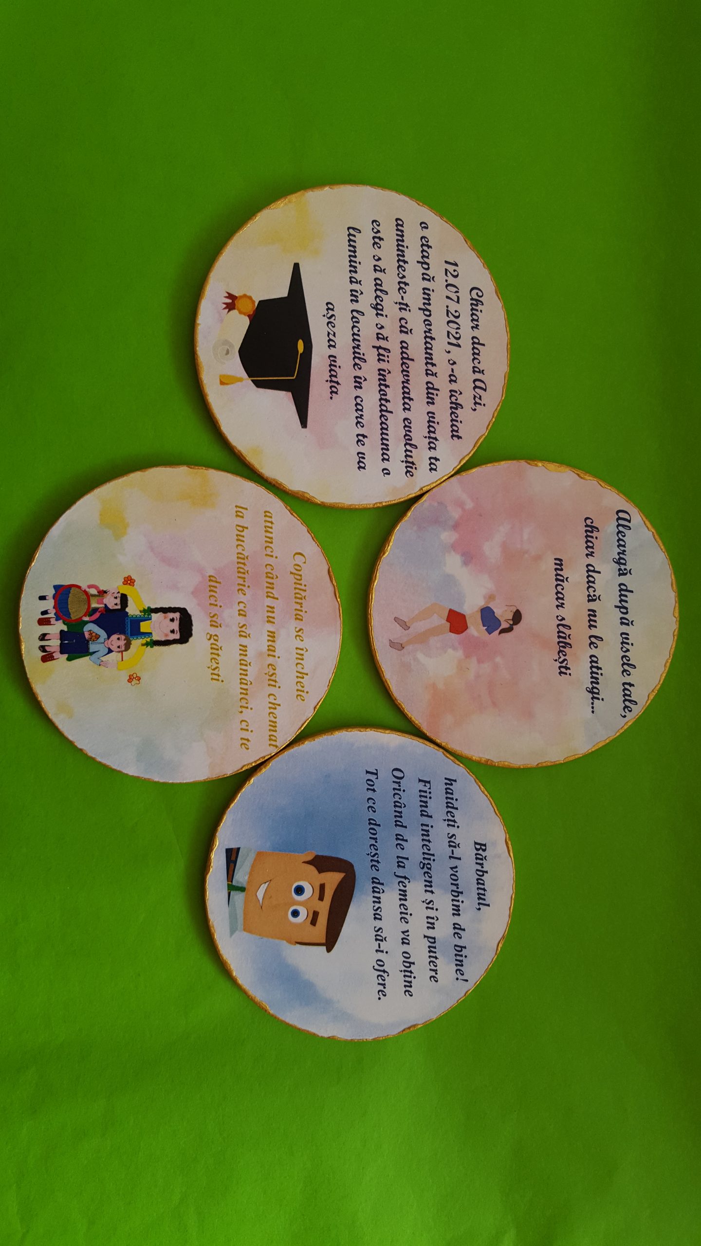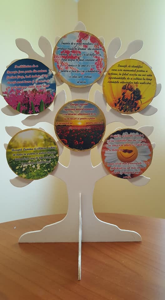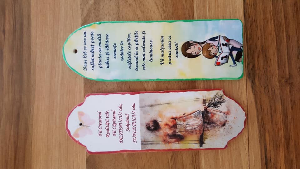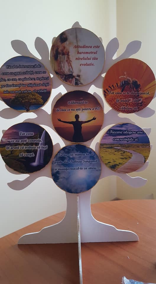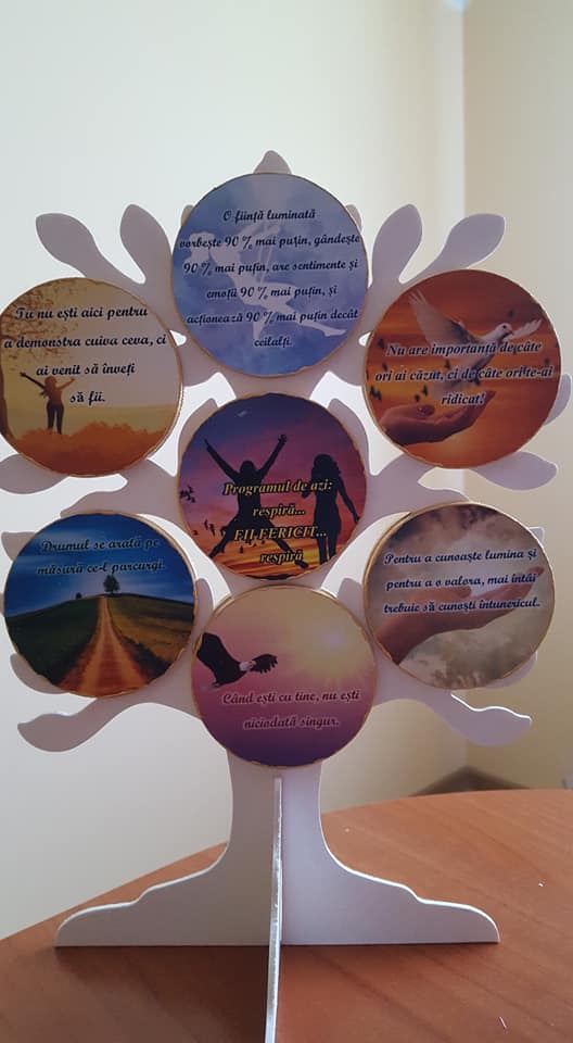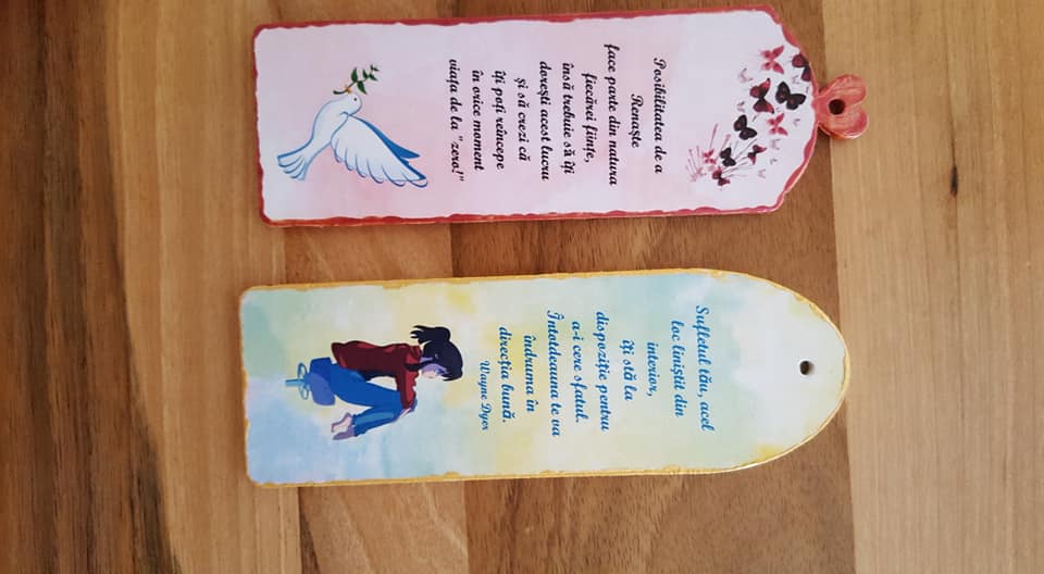 Aceste realizări sunt decorațiuni pentru biroul nostru, semne de carte, magneți pentru frigider, brelocuri, suport pixuri, etc. Toate aceste creații conțin mesaje motivaționale care au capacitatea de a aduce o mângâiere Sufletului nostru.