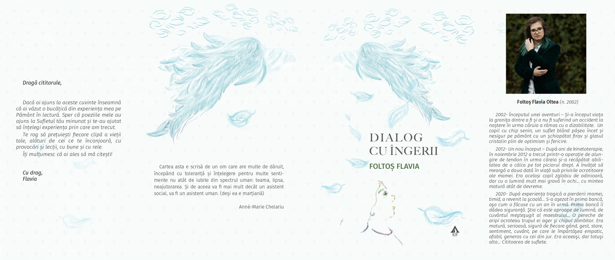 Bună! Sunt Flavia Foltoș. Am 21 de ani și sunt autoarea volumelor de poezie „Dialog cu îngerii” și „Extra-terestru”. Din 2023 conduc activitatea librăriei online www.dialogcuingerii.ro unde comercializez atât volume proprii cât și cărți ale unor autori renumiți pentru a transmite lumii povești de viață inedite cu lecții prețioase.