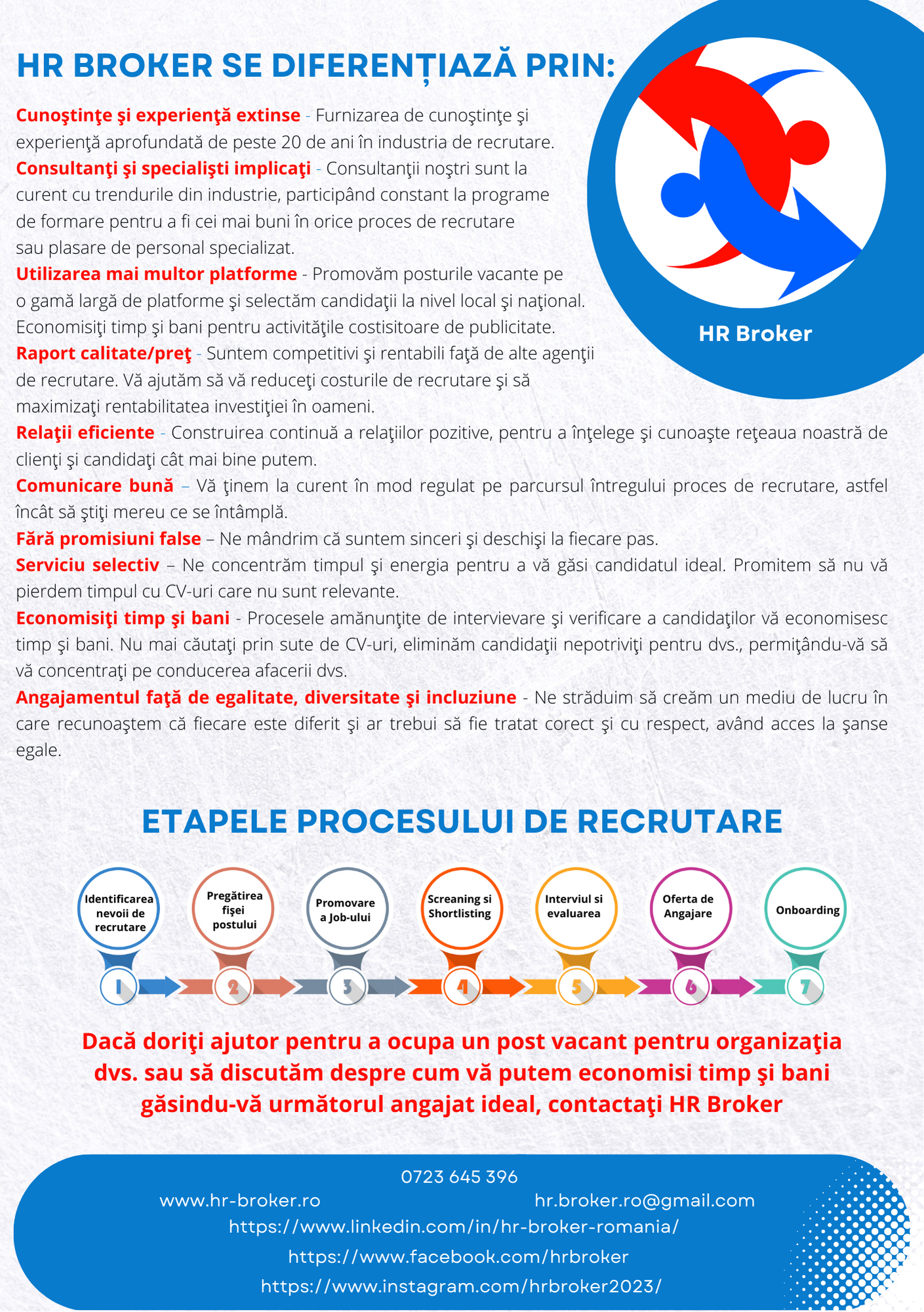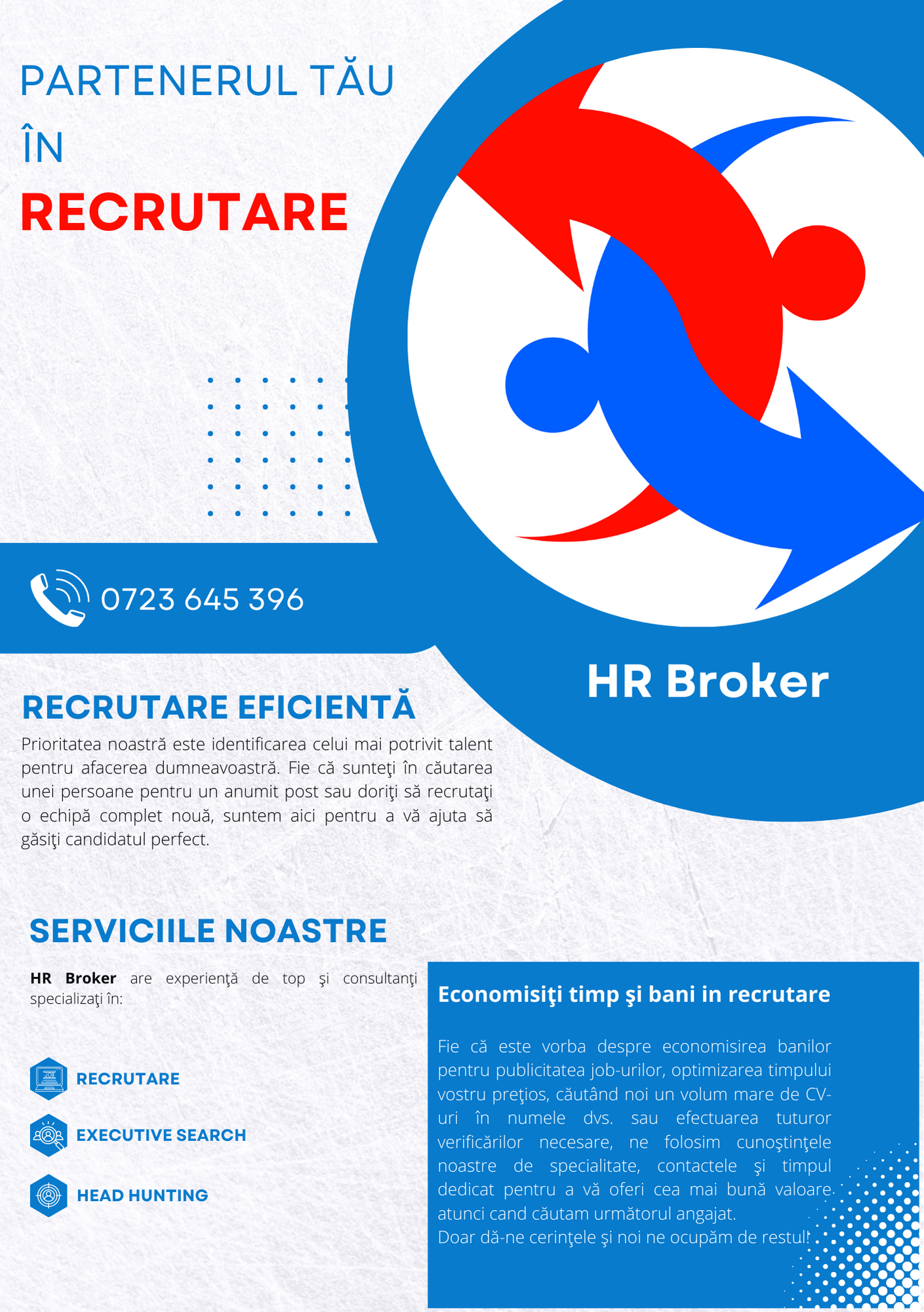 Echipa HR Broker are expertiză în recrutarea atât pentru posturi de entry level cât și pentru Middle și Top Management în majoritatea domeniilor de activitate. Dacă aveți nevoie să recrutați agenți de vânzări sau National Sales Manager, dacă doriți să găsiți cel mai loial Asistent Manager sau cel mai eficient Country Manager, este suficient să ne contactați și, împreună, vom identifica persoana ideală pentru organizația voastră.