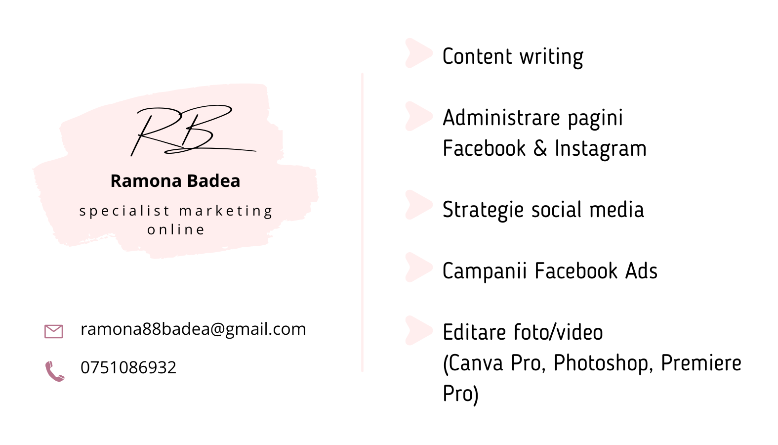 De 5 ani, ma ocup de strategie social media, administrarea conturilor de Facebook si Instagram, campanii Facebook Ads. si content writing (descriere produse, articole, optimizare SEO in page etc).