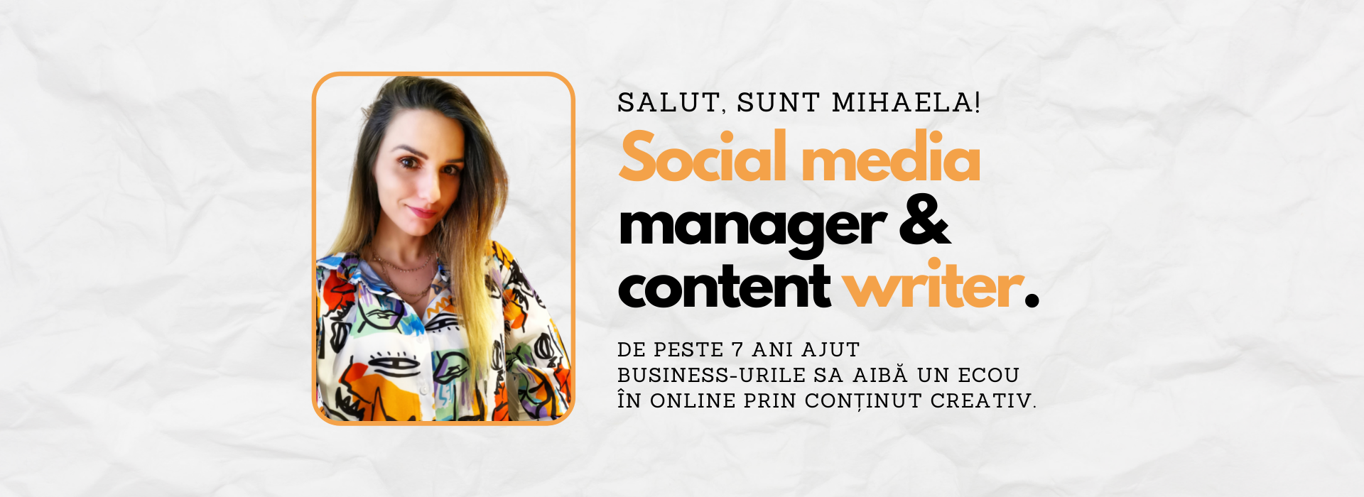 În cuvinte mai practice, mă pricep de minune să scriu texte și stau toată ziua pe Facebook și pe Instagram pentru a crește imaginea business-urilor în mediul online. Vin cu idei fresh, tactici noi și implementez strategia de comunicare online ca tu să ai mai mlt timp să te ocupi de business.