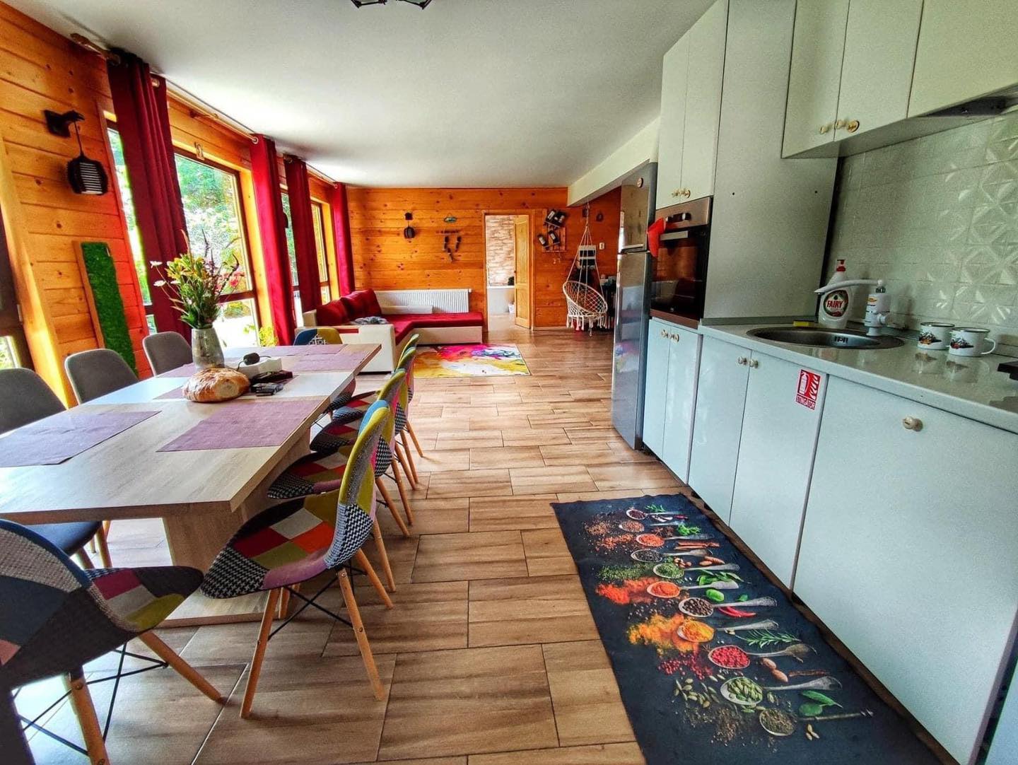 Cabana dispune de 5 camere duble cu vedere la munte sau la pârâul Viștișoara, un living open space cu șemineu – un spațiu de relaxare, cu un superb perete vitrat care privește spre munți, o bucătărie complet utilată și dotată – PLUS mașină de spălat vase, mașină de spălat rufe, aparat Dolce Gusto și pastile de cafea, o grădină înfloritoare pe timpul verii sau derdeluş iarna, curte îngrădită de 1600mp, leagane, hamace, balansoare, acces direct la râu – din curtea din spate poți avea acces direct la Râul Viștișoara, care își vede de mersul lui molcom, cât e ziua de lungă, loc de joacă pentru copii – trambulina gigant, toboganul, leagănele, hamacele sunt doar câteva dintre activitățile care îi încântă atât de mult pe cei mici.