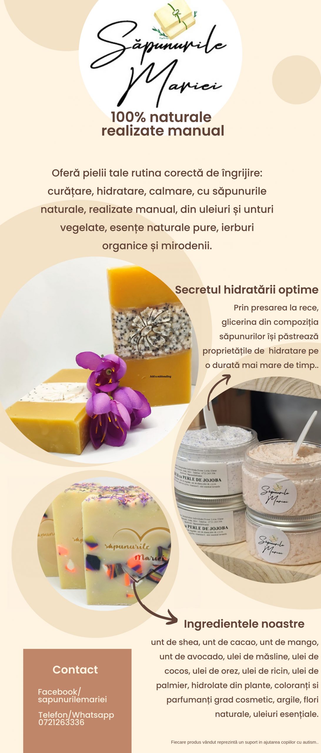 Suntem un mic atelier de produse cosmetice si asa vrem sa ramanem, tocmai pentru a realiza produse manual, care sunt unice.