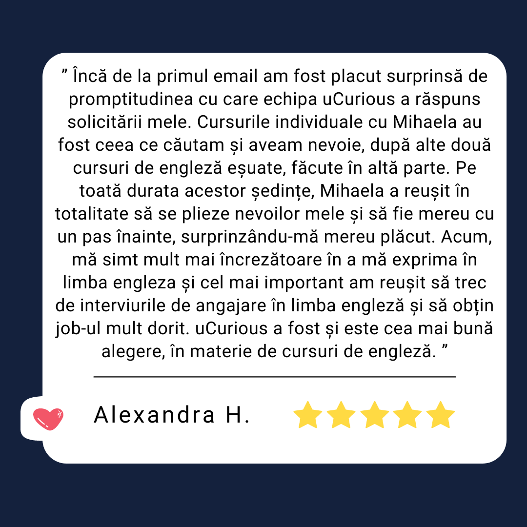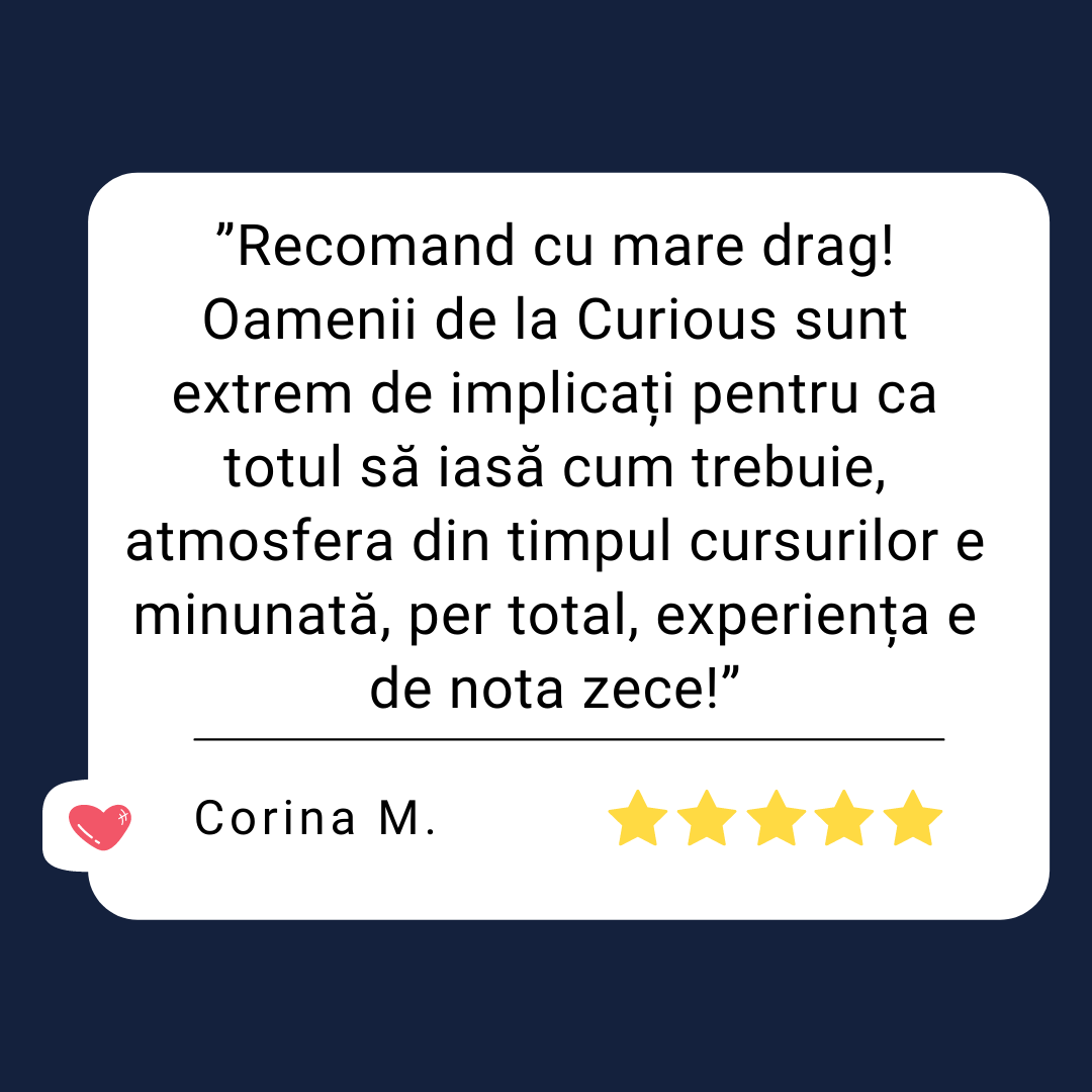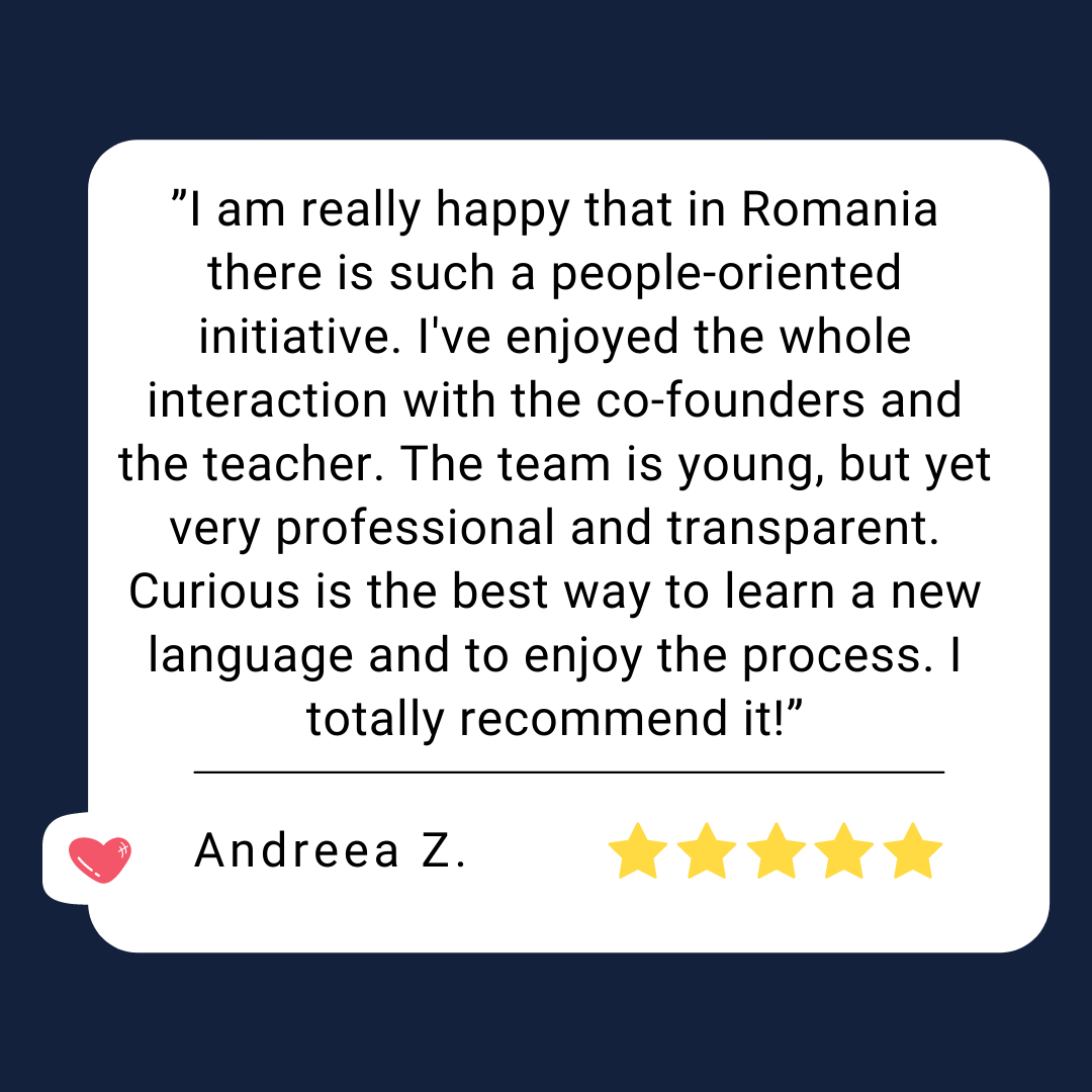 Fiecare client este unic, deci fiecare experiență de învățare este unică. La consultanța gratuită de la început, îți creem un plan personalizat de învățare prin care să îți atingi obiectivele eficient. Aducem la sesiuni subiecte de care ești interesat și ne focusăm doar pe ce ai nevoie.