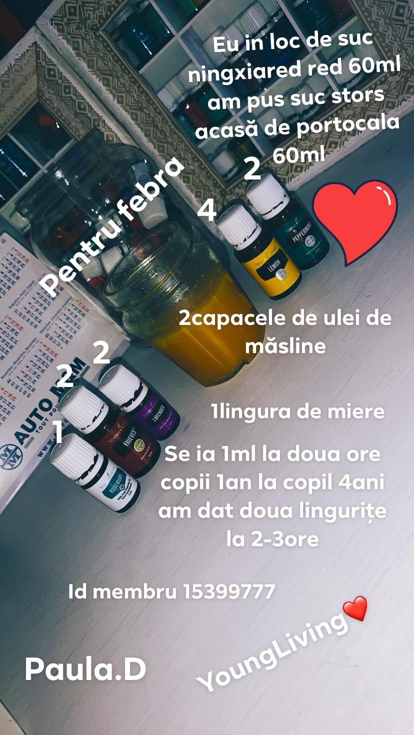 - O alta marturie a fost cu ultimul bebe care după ce am născut la nici 1luna de zile a răcit ,pentru ca fiind așa mica nimeni nu îți da absolut nimic,doar ca de teama sa nu ma interneze cu ea mai ales ca mai aveam acasă 3copilasi și neavând cu cine sa ii las am început din nou sa ma informez .Si am găsit ca aceste uleiuri se poate folosit chiar și la bebe nou născut ,am început un protocol de uleiuri pentru ea aplicate loc și puse in difiuzer iata ca și de aceasta data am rămas uimita de cât de folositoare sunt la casa omului !