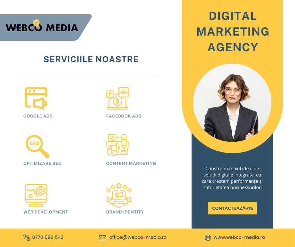 Oferim servicii complete de marketing digital, de la branding și web design ori SEO, până la social media marketing și campanii plătite pe platforme ca Facebook sau Google Ads.
