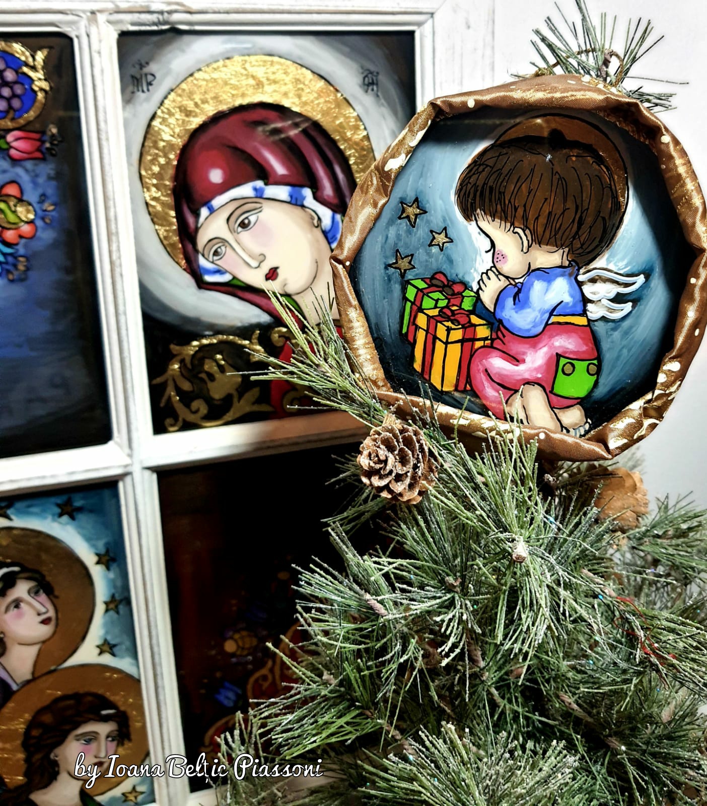 Globulet pentru pomul de Craciun pictat pe sticla in tehnica traditionala cu ret...