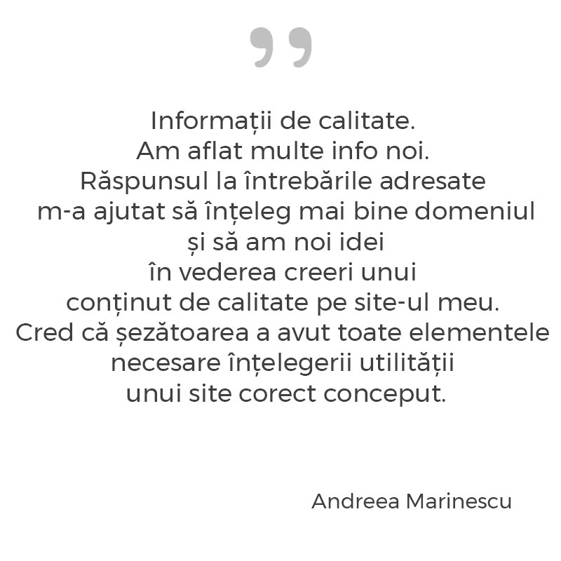 Informații de calitate. Am aflat multe info noi. Răspunsul la întrebările adresate m-a ajutat să înțeleg mai bine domeniul și să am noi idei în vederea creeri unui conținut de calitate pe site-ul meu. Cred că șezătoarea a avut toate elementele necesare înțelegerii utilității unui site corect conceput. – Andreea Marinescu