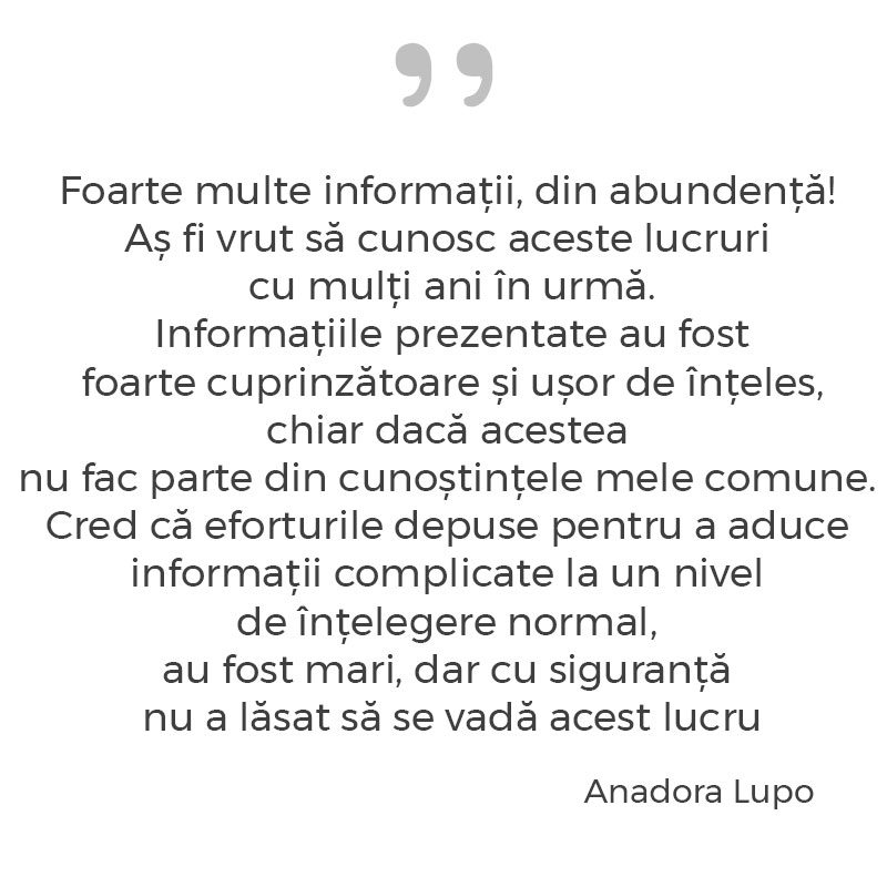 Foarte multe informații, din abundență! Aș fi vrut să cunosc aceste lucruri cu mulți ani în urmă. Informațiile prezentate au fost foarte cuprinzătoare și ușor de înțeles, chiar dacă acestea nu fac parte din cunoștințele mele comune. Cred că eforturile depuse pentru a aduce informații complicate la un nivel de înțelegere normal, au fost mari, dar cu siguranță nu a lăsat să se vadă acest lucru. – Anadora Lupo
