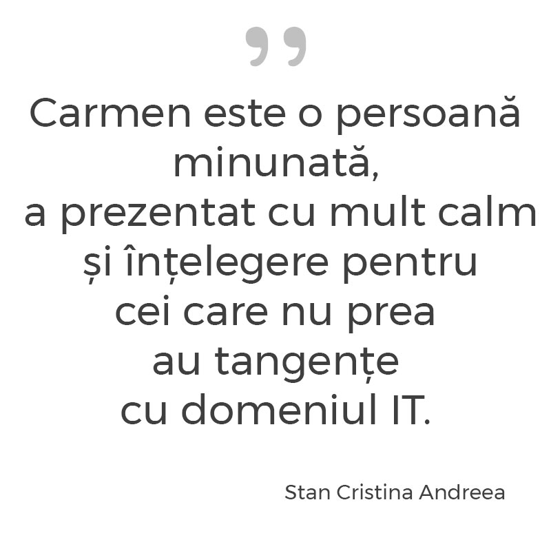 Carmen este o persoană minunată, a prezentat cu mult calm și înțelegere pentru cei care nu prea au tangențe cu domeniul IT. – Stan Cristina Andreea