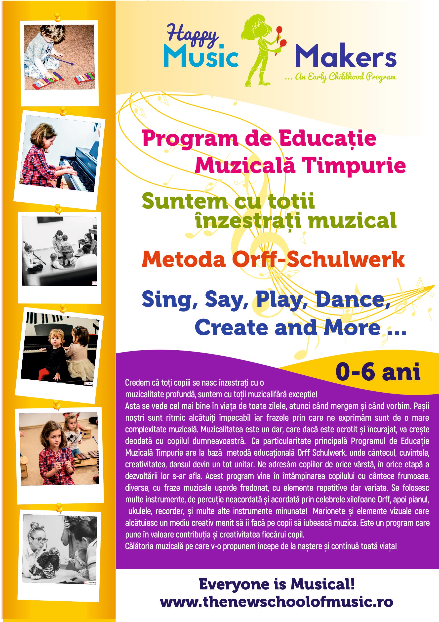 Prezentăm metode inovative pentru educația muzicală a copilăriei timpurii, cât și pentru anii următori din adolescență și viață adultă, dezvoltând programe de muzică non- tradiționale pentru toate vârstele.