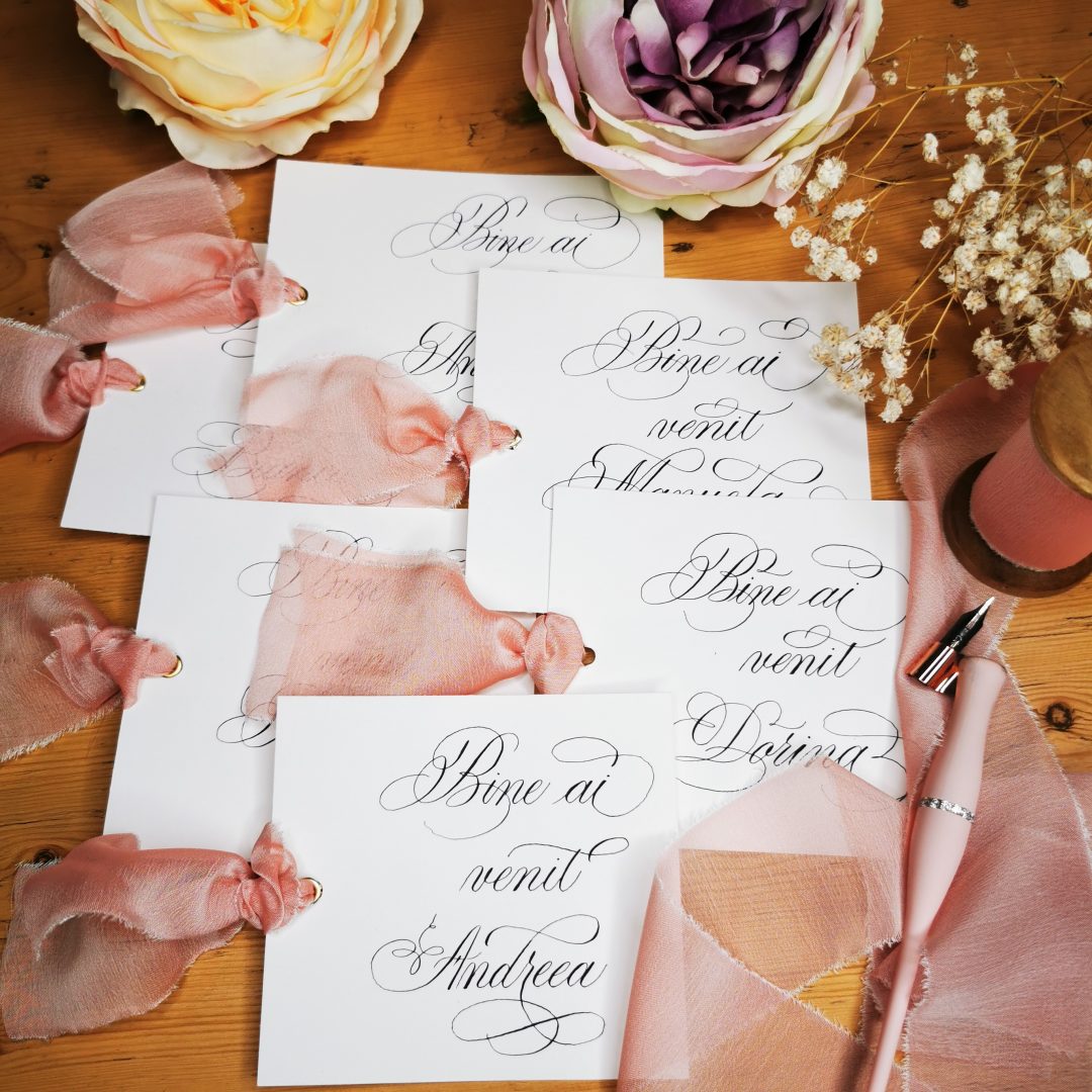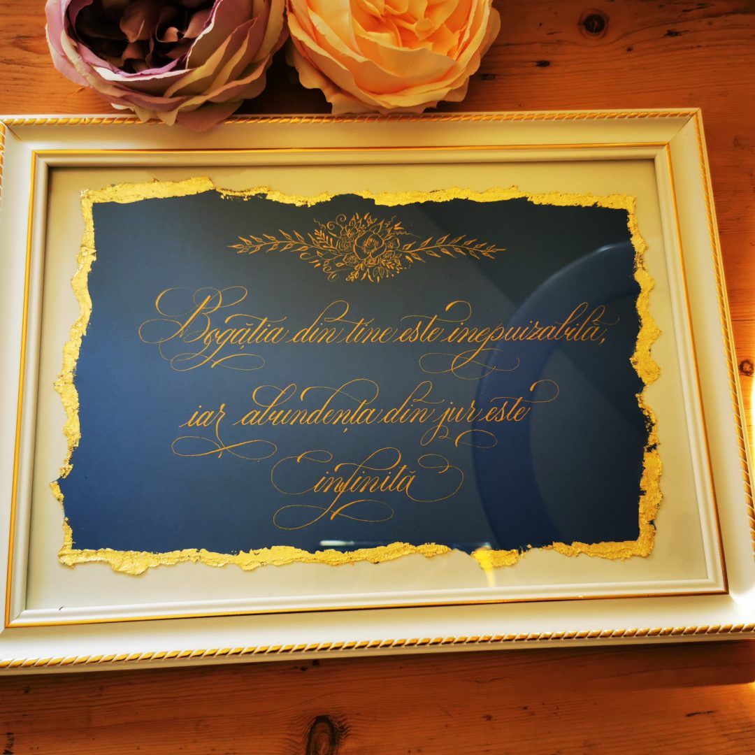 Fie că este vorba de un cadou caligrafiat sau de cursurile de caligrafie, reușesc, cu succes, să aduc în sufletul tuturor plăcuta emoție a scrierii cu toc și peniță.