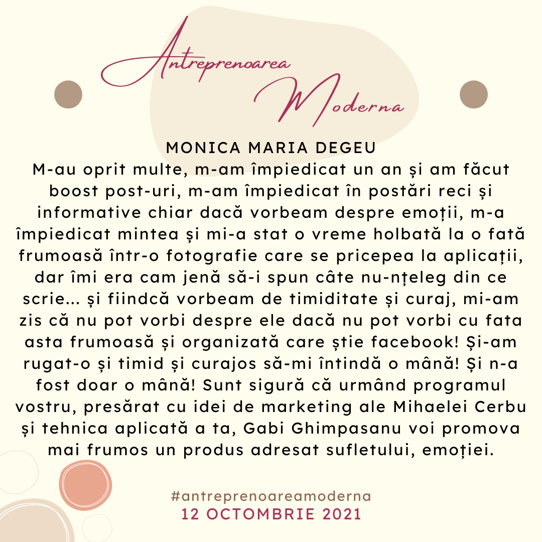Am descoperit femei interesante, cu afaceri și proiecte MINUNATE! Sunt luni de zile din momentul când am stabilit că vom forma o echipa și vom depăși împreună toate obstacolele care vor apărea.