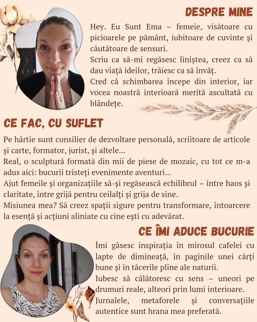 Sunt consilier în dezvoltare personală, specializată în echilibru viață-carieră pentru femei. Cu un fundal în HR și drept, am experimentat personal cum e să ai „totul pe hârtie” dar să simți gol interior. Astăzi combin cunoștințele profesionale cu lecțiile din viața reală (maternitate, burnout) pentru a crea instrumente practice – nu teoretice.Afacerea s-a născut din nevoia mea de soluții reale. După ani în juridic și HR, am atins un punct de epuizare: aveam titluri, dar nu semnificație. Am început să studiez dezvoltarea personală prin practică – experimentând pe mine însămi cum se integrează nevoile de femeie, mamă, parteneră și profesionistă.