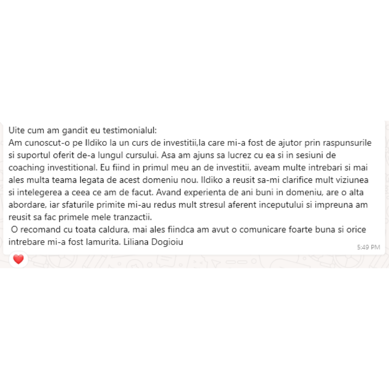 Sunt coach certificat și îmbin experiența practică din investiții cu instrumentele de coaching, pentru a oferi femeilor o transformare profundă de la nesiguranță la liniște financiară.