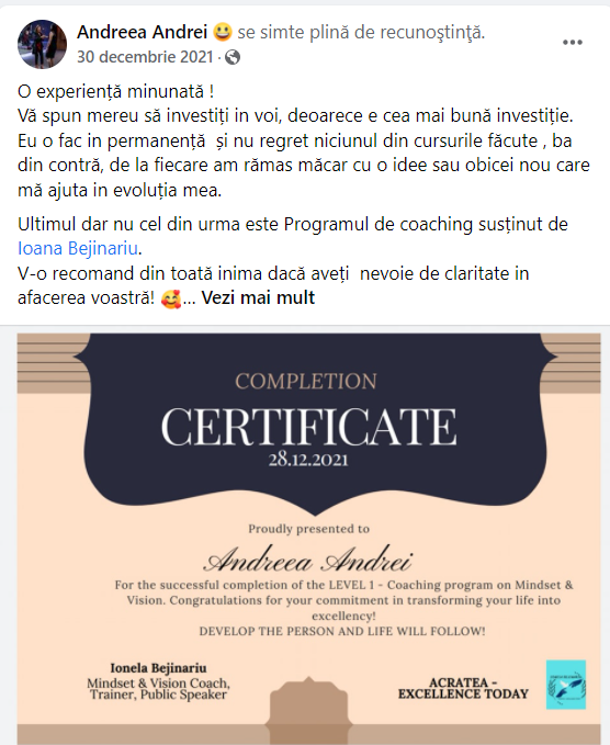 Activez în zona dezvoltării personale, în calitate de Coach & Speaker pe partea setării și menținerii pe termen lung a mentalității de succes. Acest lucru, oricât de simplu ar părea la o primă privire, ascunde un proces remarcabil de creștere personală, ce include o mulțime de conștientizări personale vizavi de modul în care ajungem să ne raportăm la situațiile întâlnite, conduși fiind de o serie de blocaje mentale auto-impuse la un moment dat. Scopul acestora a fost de a ne auto-proteja la acel moment, însă... efectele ajung să ne ghideze acțiunile și mult timp după ce pericolul a încetat să mai reprezinte un pericol. Sunt multe de adăugat aici :).Criza sanitară a fost, de fapt, momentul în care business-ul meu a luat naștere :). Acea perioadă a coincis cu faptul că de curând devenisem mamă, iar propriul meu proces de dezvoltare a început din dorința de a-i oferi copilului meu un start cât mai bun în viață. Așa am ajuns să îmi iau certificarea internațională ca și coach, trainer & speaker. Iar de aici a fost doar un pas către a deveni antreprenoarea de astăzi. Criza sanitară a fost, oricât de aiurea ar suna, fix ceea ce aveam nevoie la momentul respectiv pentru a face următorul meu pas.