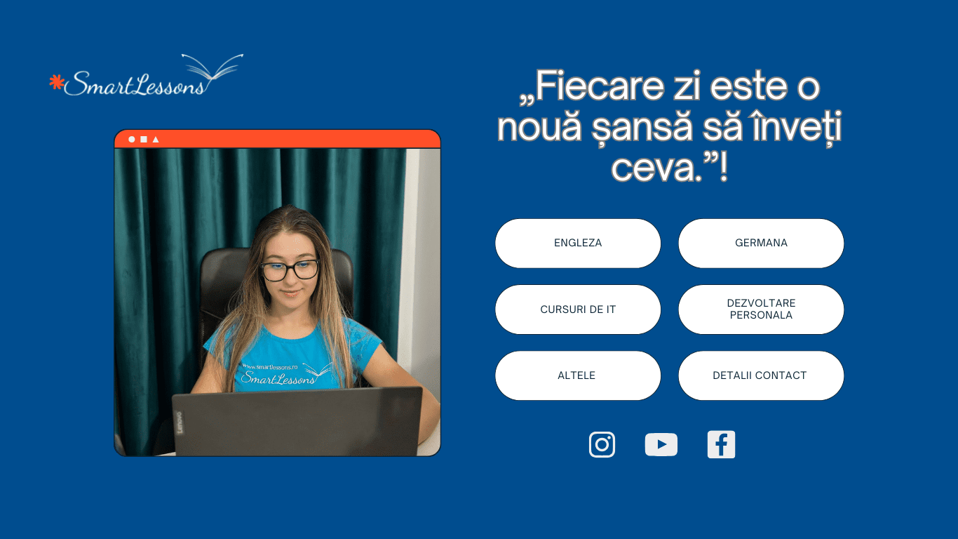 Cursuri online de Engleză, Germană, IT și Dezvoltare personală, pentru copii și adulți (6–71 ani), de la începători la avansați. Lecții video clare, materiale PDF, exerciții interactive și întâlniri live cu profesorii, direct pe platformă.