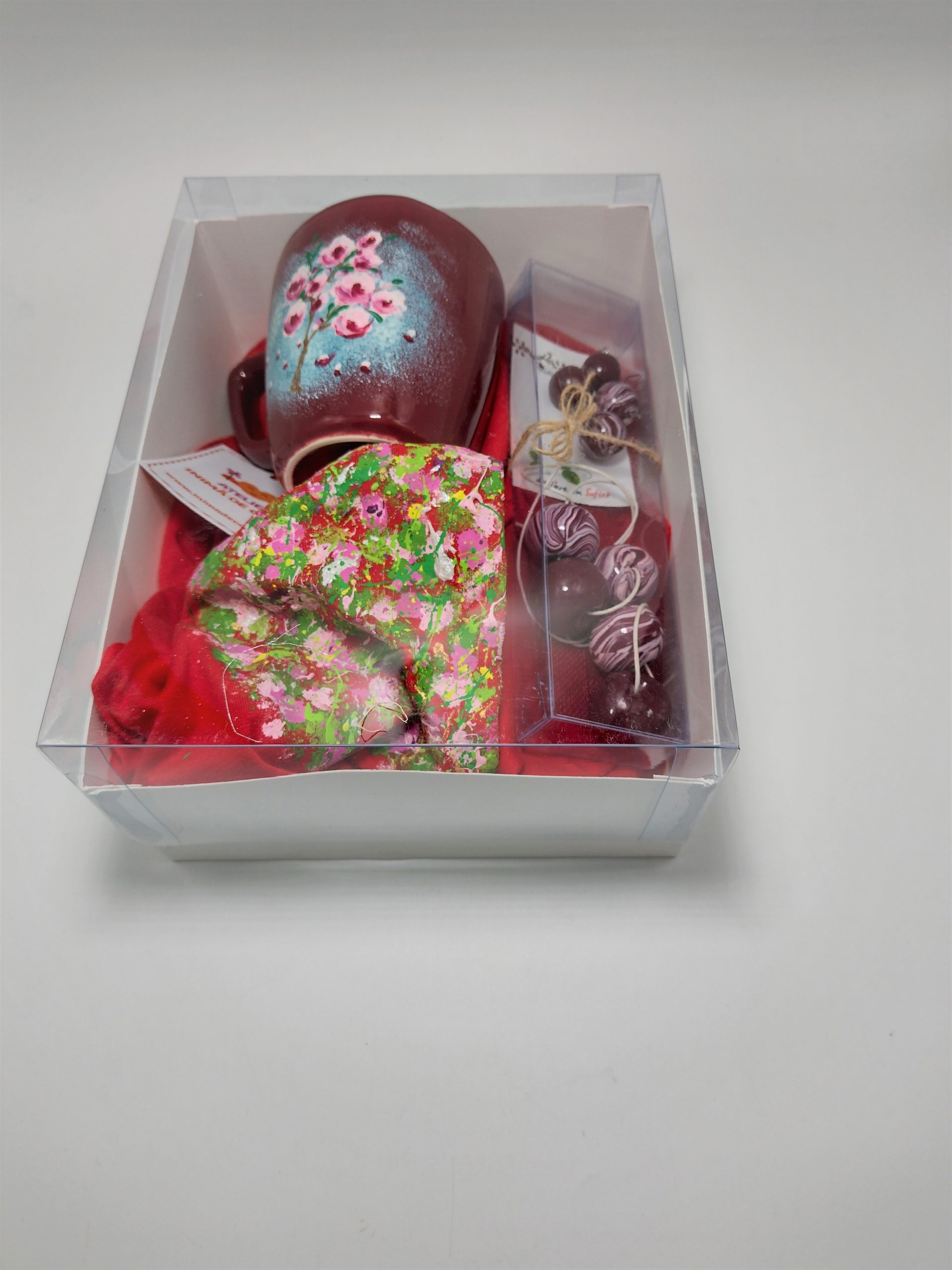 Contine un tricou rosu marimea M, pictat manual cu un superb copac inflorit, o c...