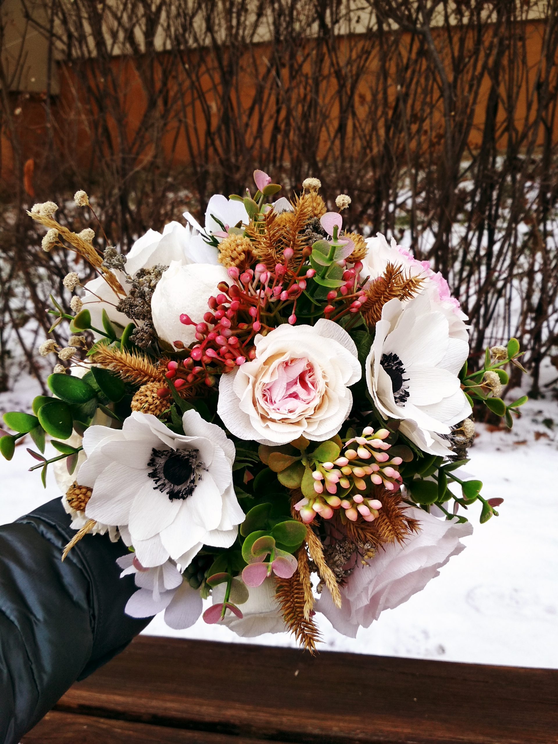 Buchet realizat cu flori de hârtie pictată, lucrate manual, petală cu petală...