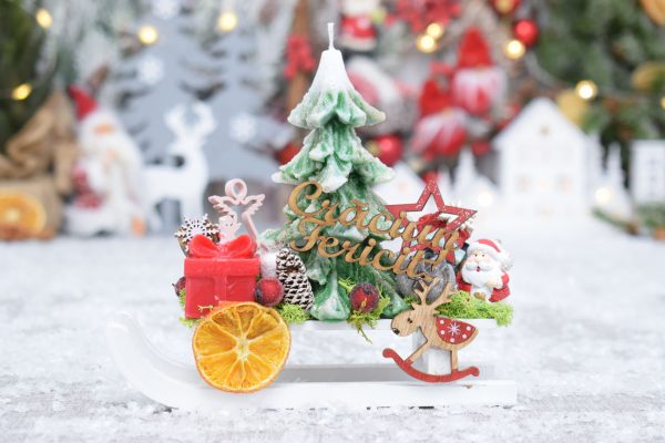 Aranjamentul este realizat manual, contine o sanie de lemn si doua lumanari parfumate (lumanare brad, lumanare cadou). Este decorat cu diferite decoratiuni tematice din lemn, plante si fructe uscate.