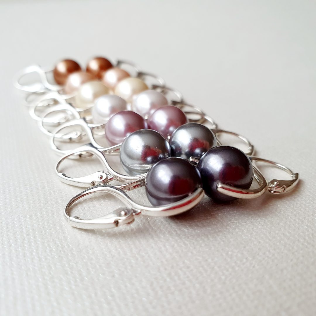 Cercei din argint 925 cu sfere de scoica de 10 mm in nuante de alb, crem, roz, lila, aramiu, gri inchis si gri deschis