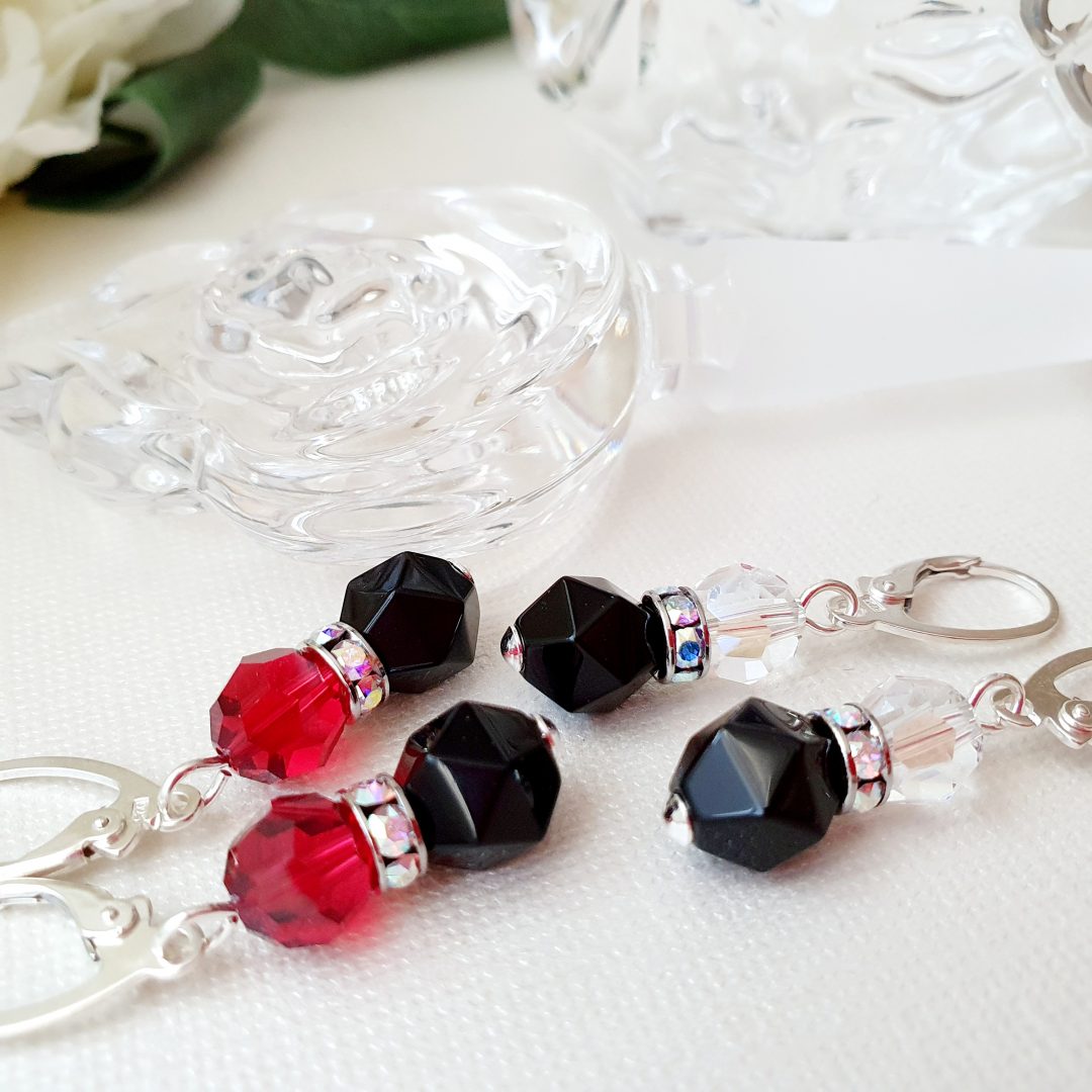 Cercei argint 925 cu onix negru de 8 mm, spacer Swarovski aurore boreale placat cu rodiu si cristale Swarovski de 8 mm in nuanta cristal sau rosu