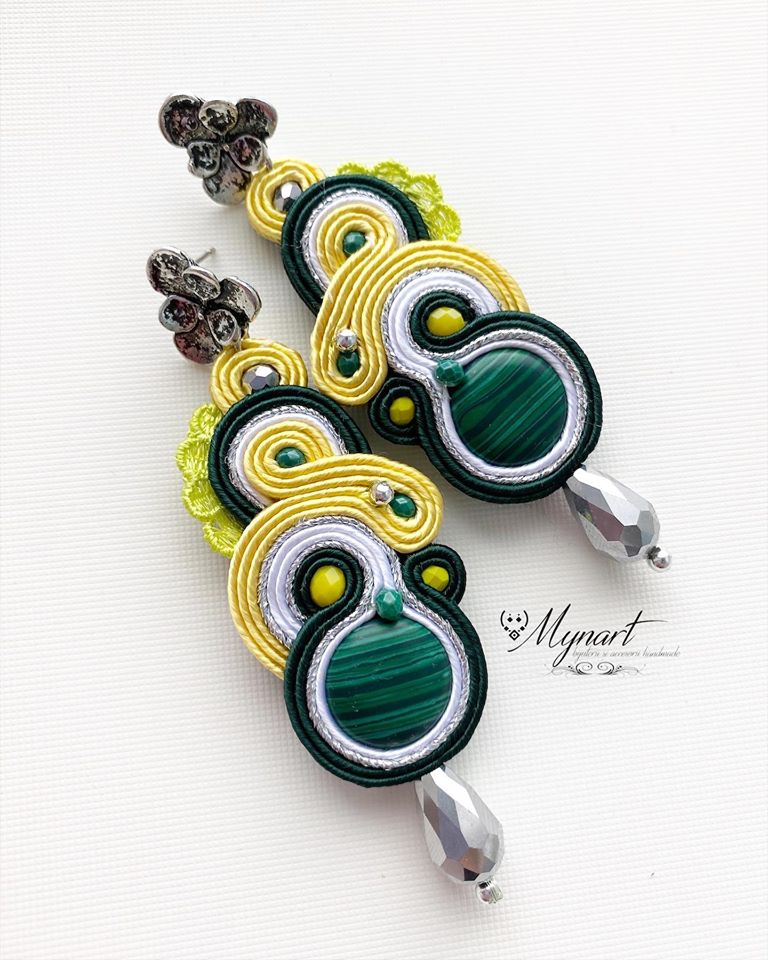 Materiale: cabochon malachit, cristale, margele acrilice aspect metali, margele firepolish, snur soutache