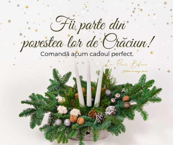 Eu sunt Andra și împreună cu echipa mea La Fleur Bohème, suntem gata să personalizăm cele mai frumoase aranjamente de Crăciun pentru tine, prietenii tăi, familie, echipă sau chiar partenerii de business.