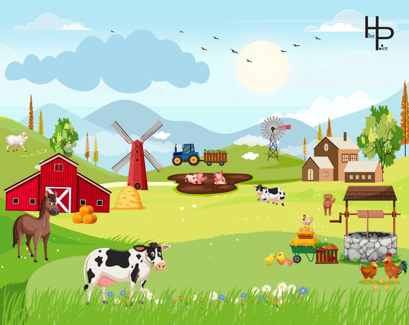 Covoras impermeabil printat cu scene din ferma animalelor. Covorasul vine insotit de un set de 11 animale de ferma cu ajutorul carora copiii pot crea o intreaga poveste pe plansa de joc si totodata pot invata unde este locul fiecareia la ferma.