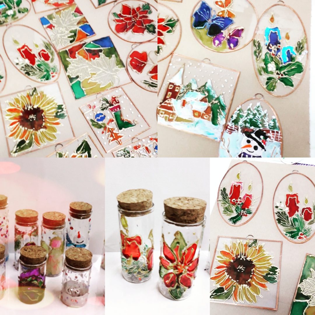 Pe sticla globuri sau minivitralii,pe lemn ,pe polistiren sub forma de globuri,agende ,cutii,semne de carte si felicitari pictate.