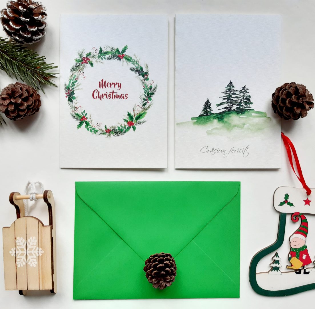Felicitări de Crăciun realizate după ilustrații originale pictate în acuarelă și printate pe carton special, texturat, sidefat.