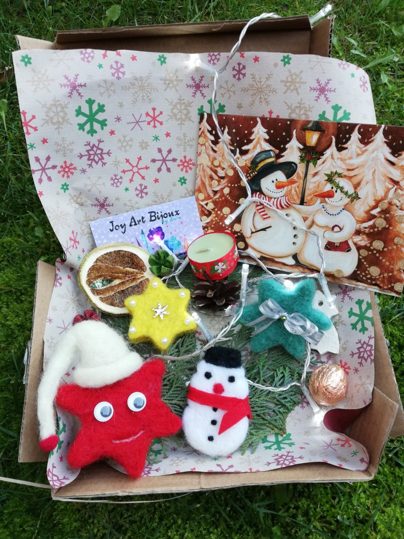 SET- contine patru decoratiuni din lana pentru brad realizate prin impaslire cu acul ,o decoratiune din lut,lumanare parfumata, o felie portocala uscata, doua mici plante uscate, o nuca in foita aurie si cadou 🎁 o felicitare pe care puteți sa o oferiți cadou celor dragi.