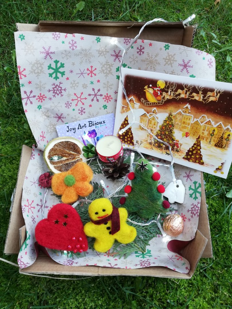 SET- contine patru decoratiuni din lana pentru brad realizate prin impaslire cu acul ,o decoratiune din lut,lumanare parfumata, o felie portocala uscata, doua mici plante uscate, o nuca in foita aurie si cadou 🎁 o felicitare pe care puteți sa o oferiți cadou celor dragi