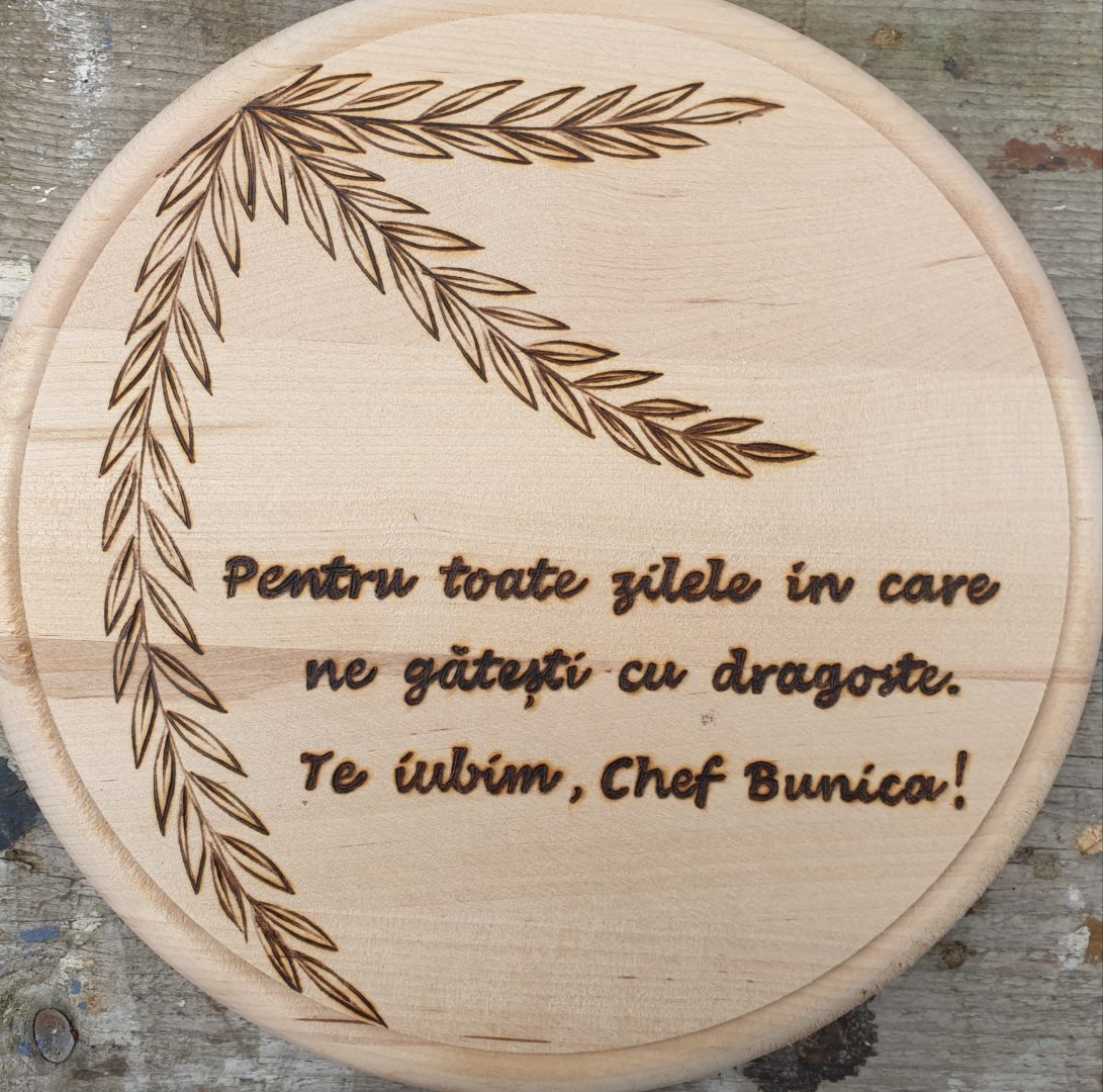 Tocator tip farfurie, din lemn, personalizat prin pirogravare! Se poate personaliza cu orice text. Poate fi insotit si de lingura/spatula!