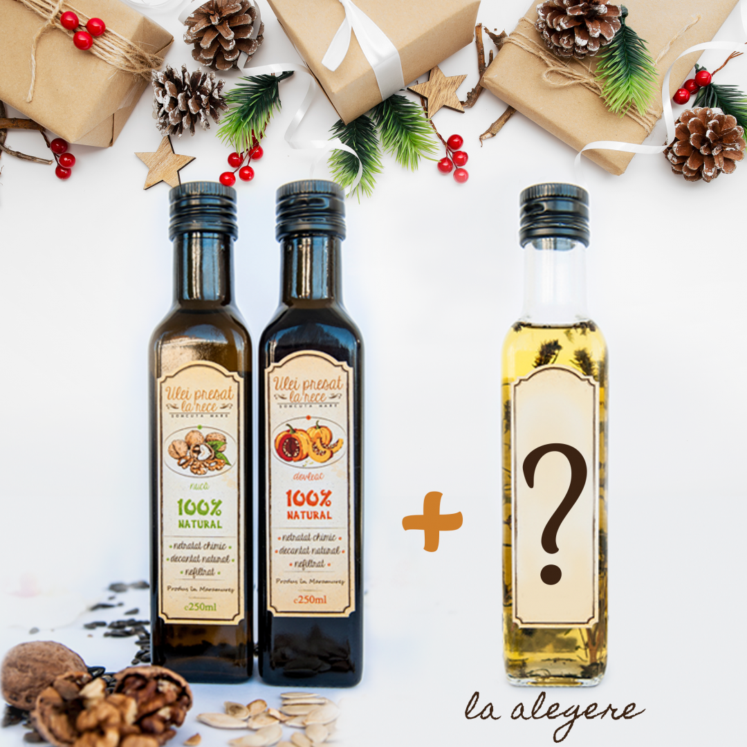 Va punem la dispozitie 3 uleiuri presate la rece, produse in Maramures din seminte romanesti cu coaja, achizitionate din zona noastra.