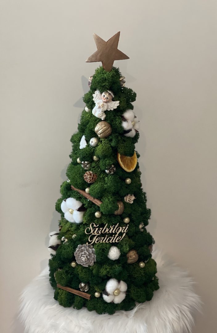 Brad de Craciun din licheni stabilizati, decorat cu scortisoara, nuci, anason si flori de bumbac