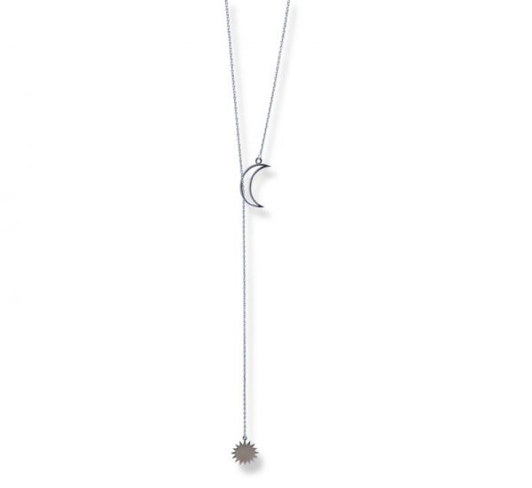 Colier realizat din argint 925 rodiat pe care sunt prinse doua pandantive in forma de soare si luna. Modern, minimalist va completa discret tinutele preferate.