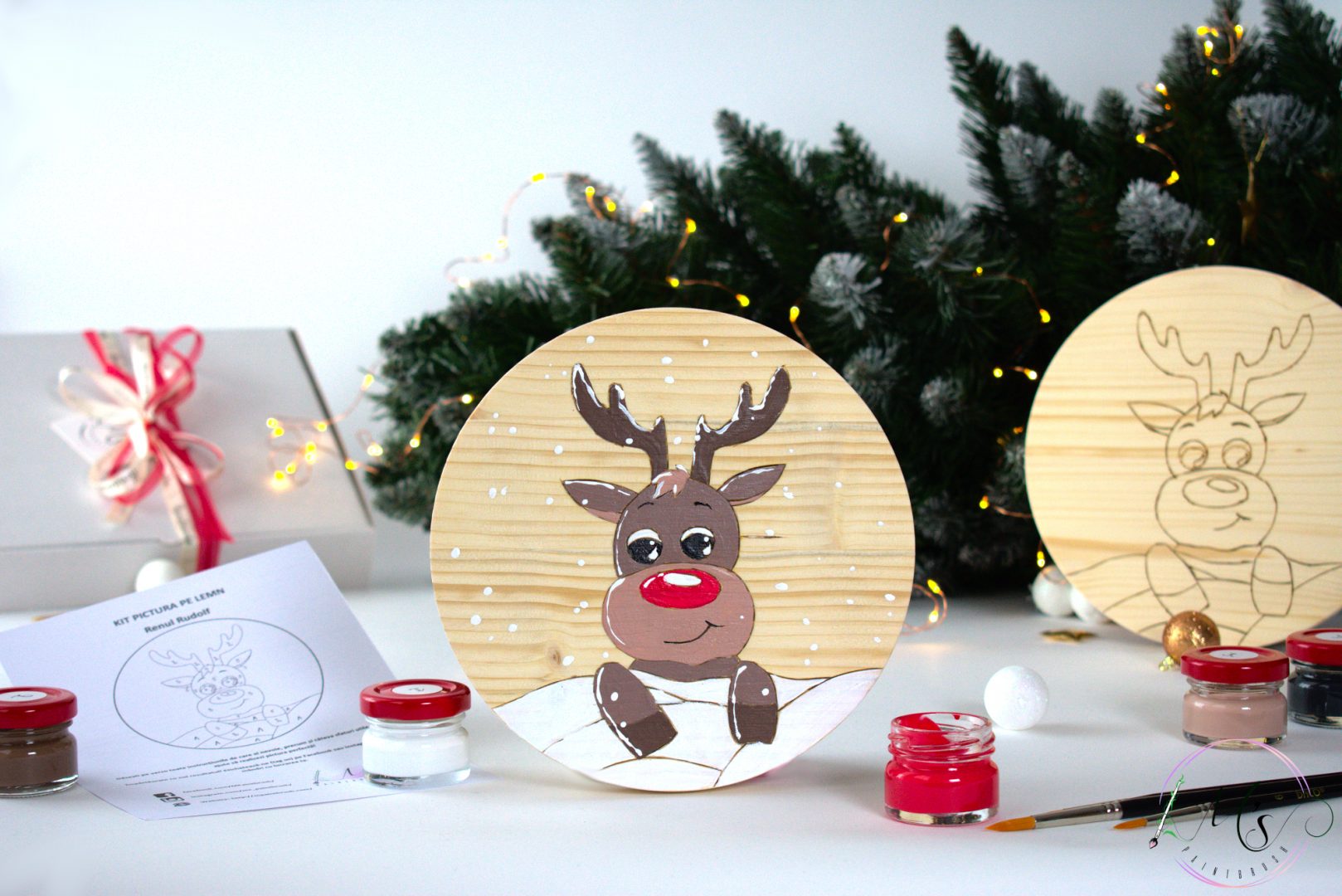 Kit pictură – Renul Rudolf ce include: cercul de lemn pirogravat manual, un set de 3 pensule de dimensiuni diferite, 6 recipiente cu vopselele necesare și setul de instrucțiuni. Cercul de lemn este prevăzut cu sistem de agățare pe spate.