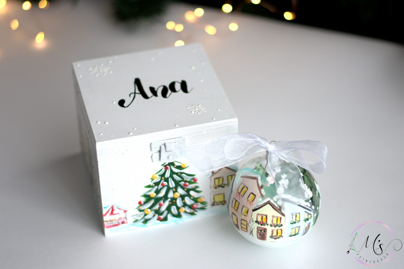 Set Crăciun- Orășel, format dintr-un glob de sticlă și o cutie de lemn.