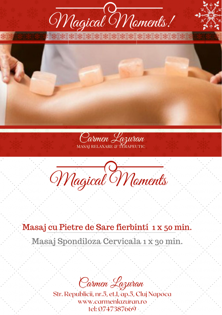 Masajul perfect pentru a alunga oboseala si stresul, pentru a stimula imunitatea si pentru a-ti energiza intregul corp. Dupa hidratarea corpului cu ulei aromatic, terapeutul iti va masa intregul corp folosind pietre de sare calde. Sub efectul antiinflamator al sării marine, musculatura spatelui se va relaxa și va beneficia din plin de masajul cu pietre calde. Apoi rasfatul va continua cu un masaj teraeutic special pentru spondiloza cervicala cu manevre speciale streching și presopunctură.