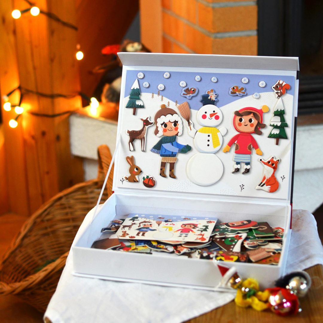 Cartea conține până la 110 magneți concepuți de populara ilustratoare slovacă Edita Hajdu. Printre magneți veți găsi – de exemplu – un brad de Crăciun, ornamente, cadouri, un om de zăpadă, o sanie, Moș Crăciun cu o pungă plină de bunătăți, un om de turtă dulce sau personaje care îi înfățișează pe copii, părinți, bunici, animale adorabile și multe altele.